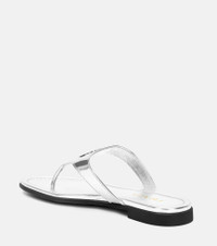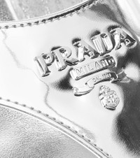 Embrace the enduring appeal of the T-bar sandal silhouette with this vacation-ready pair from Prada. They've been made in Italy from high-shine silver leather and are finished with embossed logo detailing on the bridges. Product Details - Toe shape: round open toe - Lining: leather - Sole: leather insole, rubber sole - Upper: calf leather - Made in Italy - Designer color name: Argento - Item number: P00435597 Size & Fit - True to size - European sizes - 2,0cm-1" heel (size EU 38)