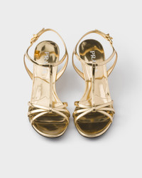 Slim straps meet a bold wedge heel in these metallic leather sandals. The iconic geometric shape of the Prada triangle embellishes the style. - Product code: 1X383O_3AU1_F0522_F_055 - Upper with logo-engraved metal buckle - Enameled metal triangle logo - Leather and rubber monoblock sole with hot-stamped logo - Leather-covered wedge heel, height 55 mm - Imported MATERIALS Main material: Calfskin