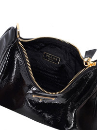 PRADA MINI RE-EDITION BAG IN BLACK PATENT CRINKLE WITH REMOVABLE GOLD METAL CHAIN HANDLE, REMOVABLE GOLD METAL RING KEYRING, ADJUSTABLE AND REMOVABLE SHOULDER STRAP, GOLD ENAMELED METAL TRIANGLE LOGO ON THE FRONT, ZIPPER CLOSURE, AND ONE INTERIOR COMPARTMENT. PRODUCT INFO PRODUCT CODE 1BC204 QOM 2DNTF0002 COMPOSITION: 100% LAMBSKIN SIZE AND FIT: H 18 X W 22 X D 6 CM MADE IN: ITALY