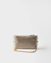 Sleek lines and precious details define this satin clutch covered with crystals applied by hand. The accessory, completed with a chain shoulder strap, is decorated with the iconic enameled metal triangle logo. - Product code: 1BF142_2HNJ_F0GCN_V_OOD - Removable chain shoulder strap, length 120 cm - Metal hardware - Enameled metal triangle logo on the front - Zipper closure - Satin lining with patch pocket - Imported Height: 14cm Width: 22cm MATERIALS Main material: Silk viscose