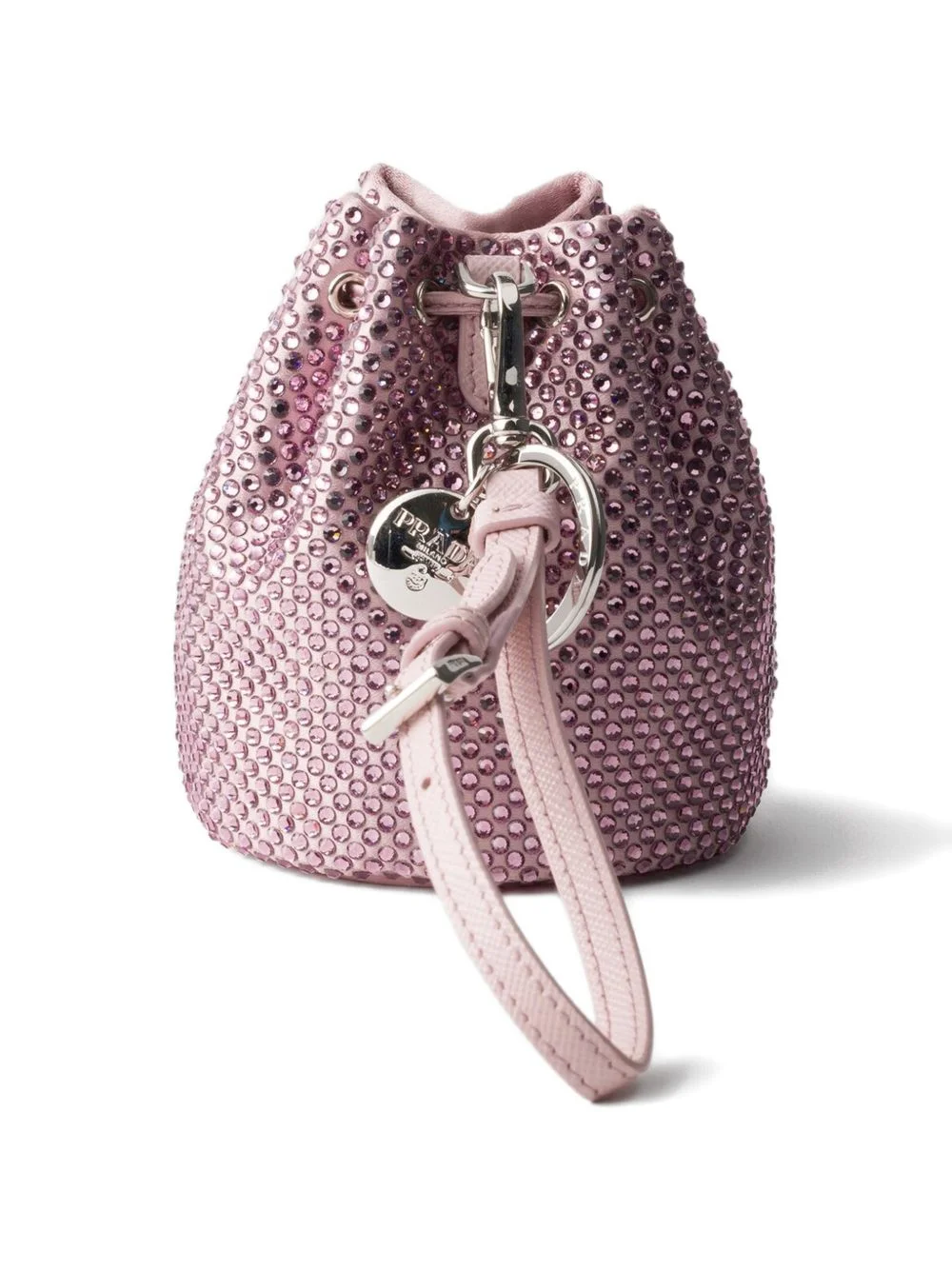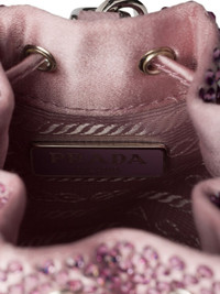 mini Icon satin and crystals keychain charm Highlights - This satin and crystals charm transforms an iconic silhouette of prada’s collections into a sophisticated accessory. the dazzling design enriches bags or completes looks with a unique, personal touch. - Detachable leather wristlet - Enameled metal triangle logo Composition Outer: Crystal 100%, Satin 100%