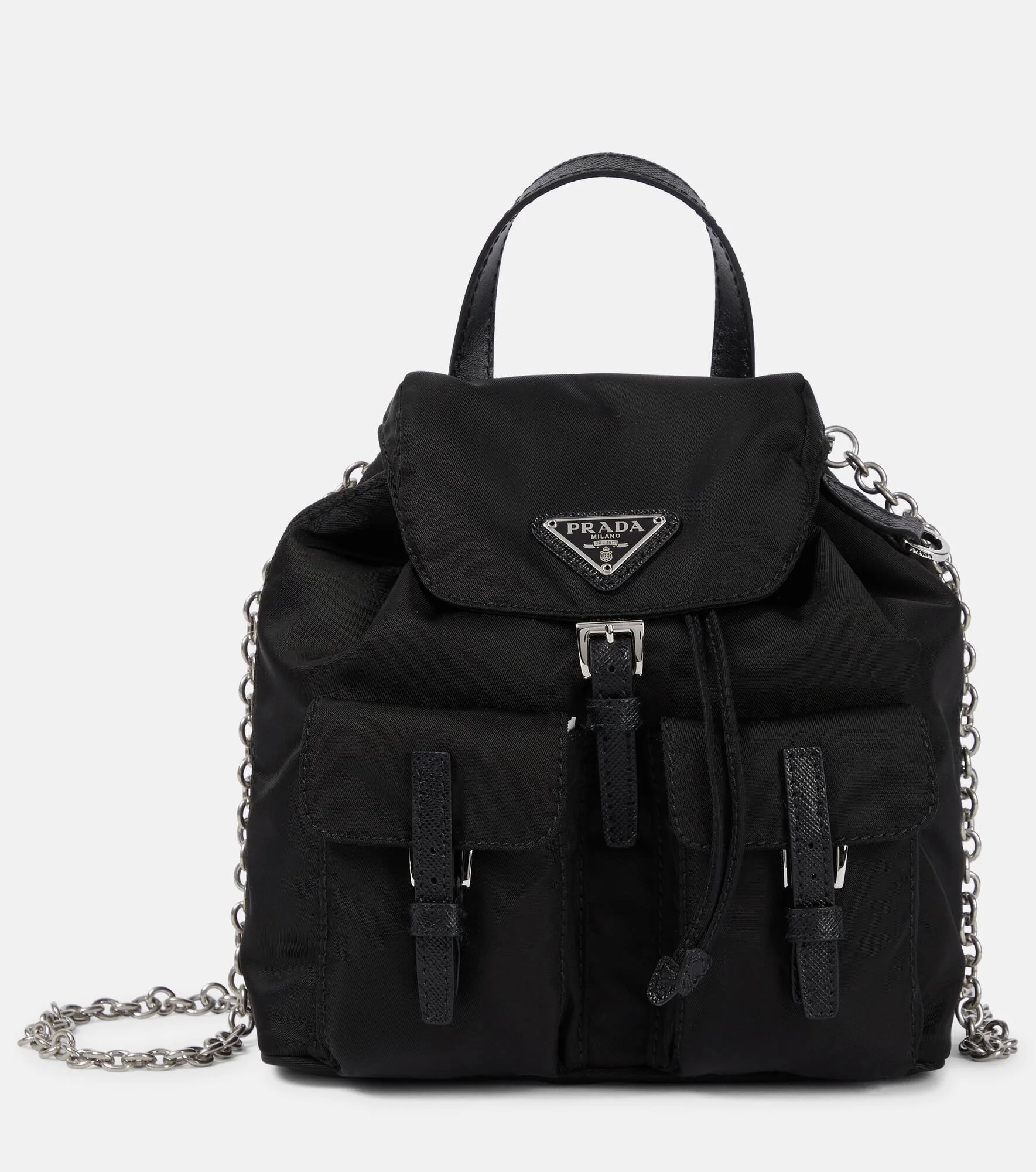A Prada nylon backpack is as coveted now as it was in the '90s, and here it's been re-imagined in petite form. The black design has a drawstring top, flap pockets and a triangle logo plaque. A top handle and silver-tone chain straps allow versatile styling options. Product Details - Trim: calf leather - Designer color name: Nero - Comes with dust bag - Top handle, Detachable chain shoulder strap - Front pocket - Material: fabric - Internal details: fabric lining - Closure: drawstring top - Item number: P00483453 Size & Fit - Height 16cm-6.5" - Width 16cm-6.5" - Depth 8cm-3" - Chain length 110cm-43.5"