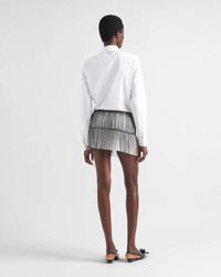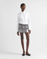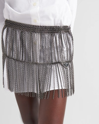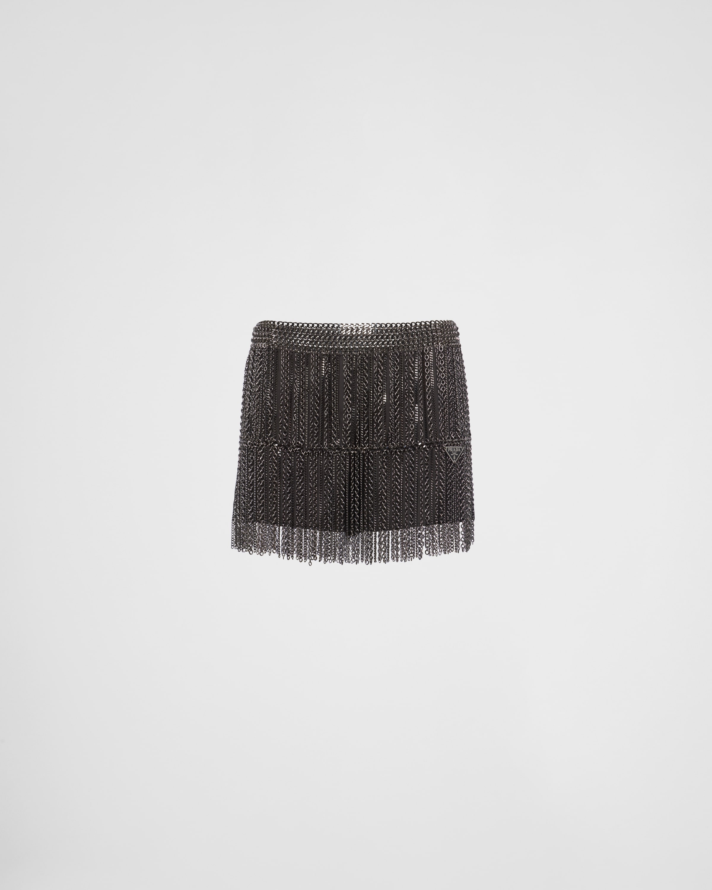 A feminine design with a minimalist silhouette is reinterpreted with bold jewel details. Made with a delicate structure of metal chain fringe, this precious miniskirt with a dynamic silhouette is perfect for eclectic combinations typical of Prada style. The refined garment accompanied by a slip is decorated with the iconic enameled metal triangle logo. - Product code: P198XR_13YJ_F0276_S_OOO - Pencil silhouette - Garment with slip - Side hook closure - Enameled metal triangle logo - Imported - The model is 180 cm tall and wears a size 38 Height: 40cm MATERIALS Metal