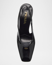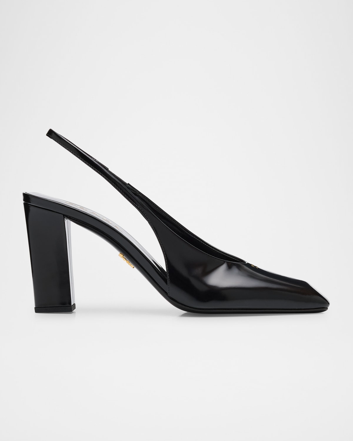 - Prada sleek leather pumps with contrast embossed logo accent - 3.25 in / 85 mm block heel - Square toe - Stretch slingback strap - Rubber outsole - Professional cleaning recommended - Made in Italy - Size Note: Runs true to size.