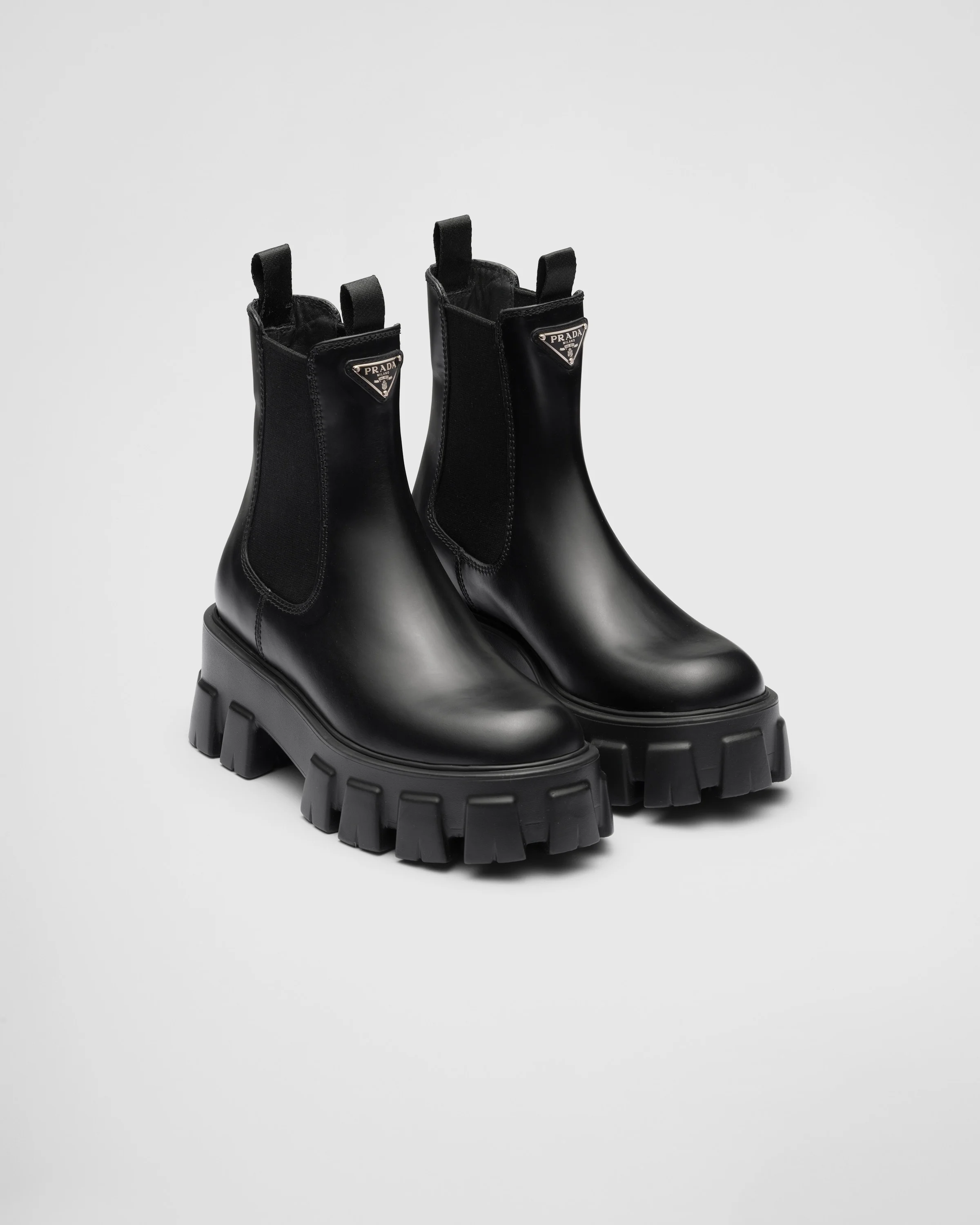 These original, bold booties enhance the duality concept that is fundamental in the brand aesthetic. The modernist maxi-sole with a unique and monolithic design is combined with the brushed leather upper with a rigorous look. A hybrid yet harmonious soul characterizes the Monolith line that combines diametrically opposed imagery to create timeless silhouettes. - Product code: 1T256N_B4L_F0002_F_B055 - Upper with elasticized side gusset and pull tab - Leather lining - Enameled metal triangle logo - 16 cm boot leg - 55 mm rubber sole - Lug tread - Removable leather-covered insole - Imported MATERIALS Main material: Calfskin