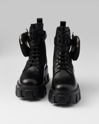 Monolith combat boots embody Prada's hybrid soul in this version made of leather and Re-Nylon defined by oversized soles with a unique design. The shoe comes with a removable pouch decorated with the iconic enameled metal triangle logo. - Product code: 1T255M_3LJS_F0002_F_G055 - Upper with removable pouch with enameled metal triangle logo - Leather lining - Prada Milano logo on tongue - Polyester laces closure - Boot leg 16 cm - Rubber sole, 55 mm - Lug tread - Removable leather-covered insole - Imported MATERIALS Main material: Calfskin