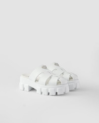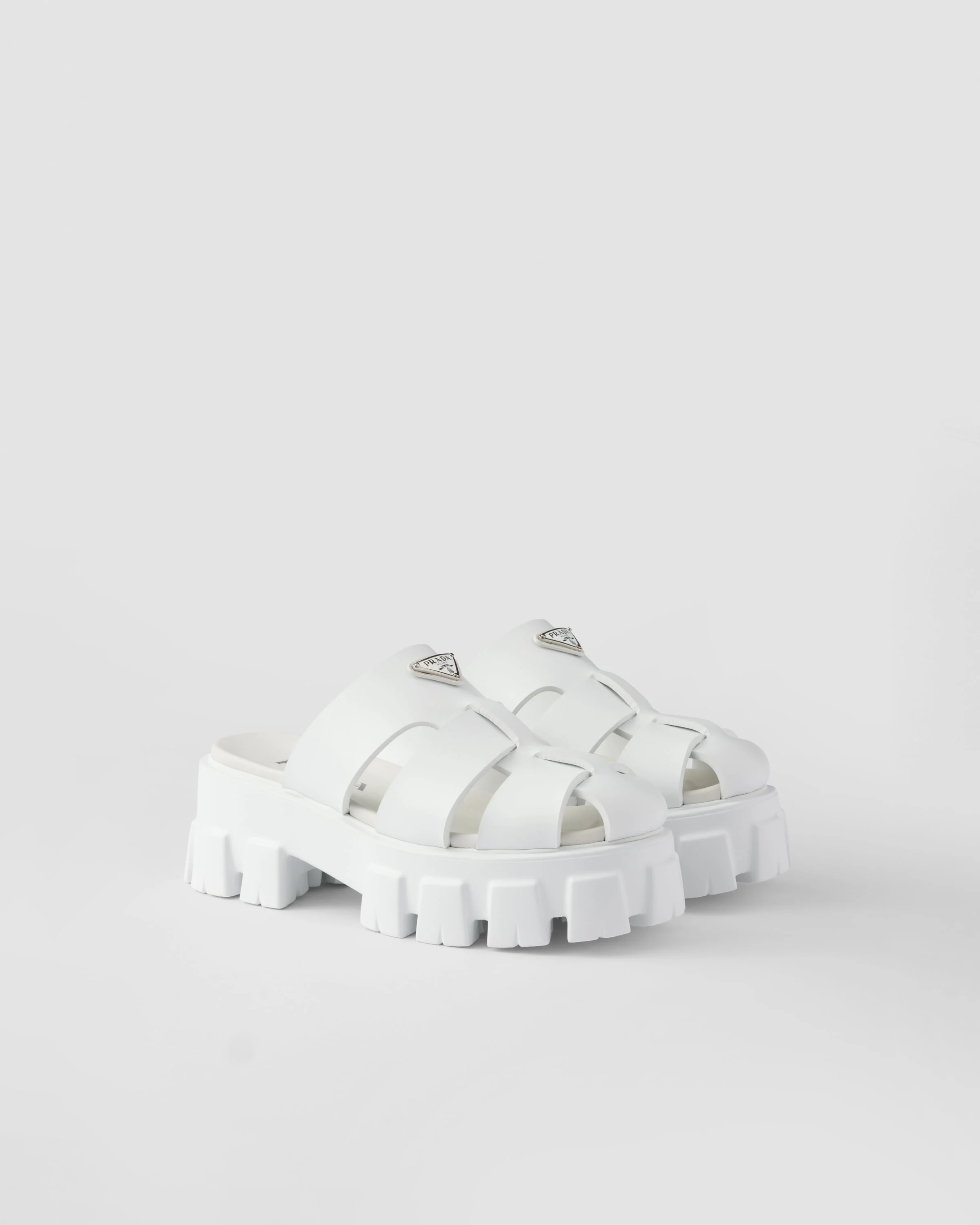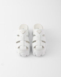The distinctive Monolith sole, characterized by oversized volumes and architectural lines, defines the silhouette of these rubber mules embellished with the emblematic enameled metal triangle logo. - Product code: 1XX751_3LKK_F0009_F_055 - Enameled metal triangle logo - Rubber sole, 55 mm - Lug tread - Imported MATERIALS Main material: Ethyl vinyl acetate - eva