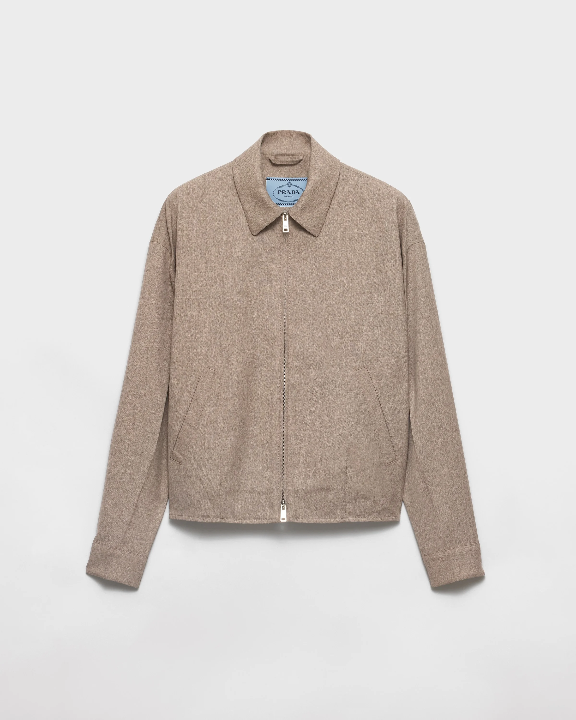 Clean lines define this mouline wool blouson jacket with contemporary style. The garment is characterized by a deliberate wrinkled effect, a distinctive detail of Prada collections. - Product code: P8006_17FT_F0036_S_OOO - Shirt-style collar - Long sleeves - Buttoned cuff - Zipper closure - Angled pockets - Unlined - Fabric triangle logo - Elasticized hem - Imported - The model is 181 cm tall and wears a size 38 Height: 54cm MATERIALS Main material: 100% virgin wool