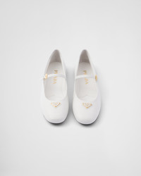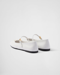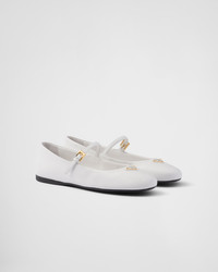 These nappa leather ballerinas with a tapered silhouette express elegant, feminine charm. The shoe with a round toe and rubber sole is defined by classic lines and sophisticated details and is embellished with the enameled metal triangle logo. - Product code: 1F567N_038_F0009_F_005 - Upper with strap and logo-engraved metal buckle - Enameled metal triangle logo - Monoblock rubber sole, 05 mm, with hot-stamped logo - Imported MATERIALS Leather
