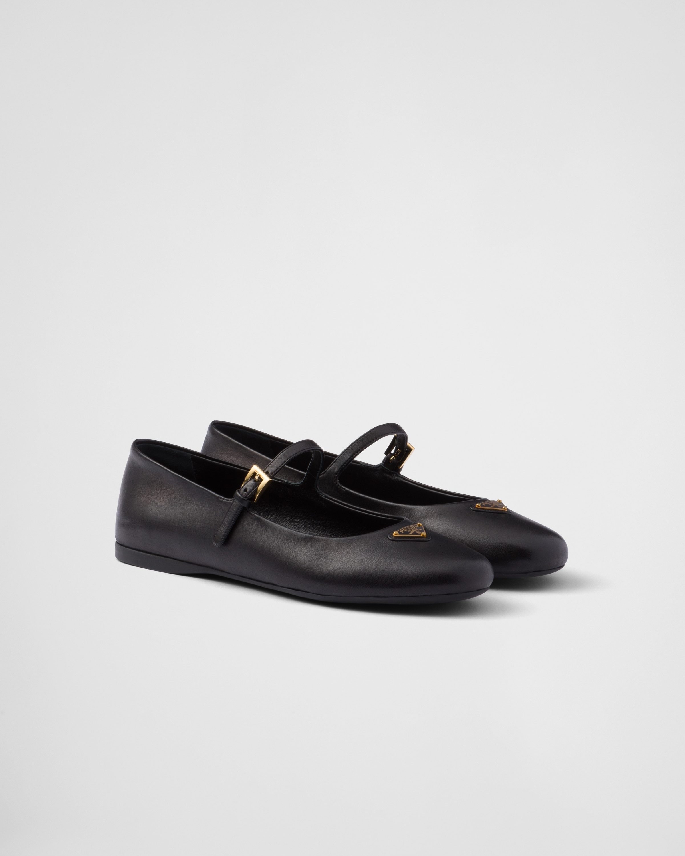 These nappa leather ballerinas with a tapered silhouette express elegant, feminine charm. The shoe with a round toe and leather sole is defined by classic lines and sophisticated details and is embellished with the enameled metal triangle logo. - Product code: 1F567N_038_F0002_F_005 - Upper with strap and logo-engraved metal buckle - Enameled metal triangle logo - Monoblock rubber sole, 05 mm, with hot-stamped logo - Imported MATERIALS Leather