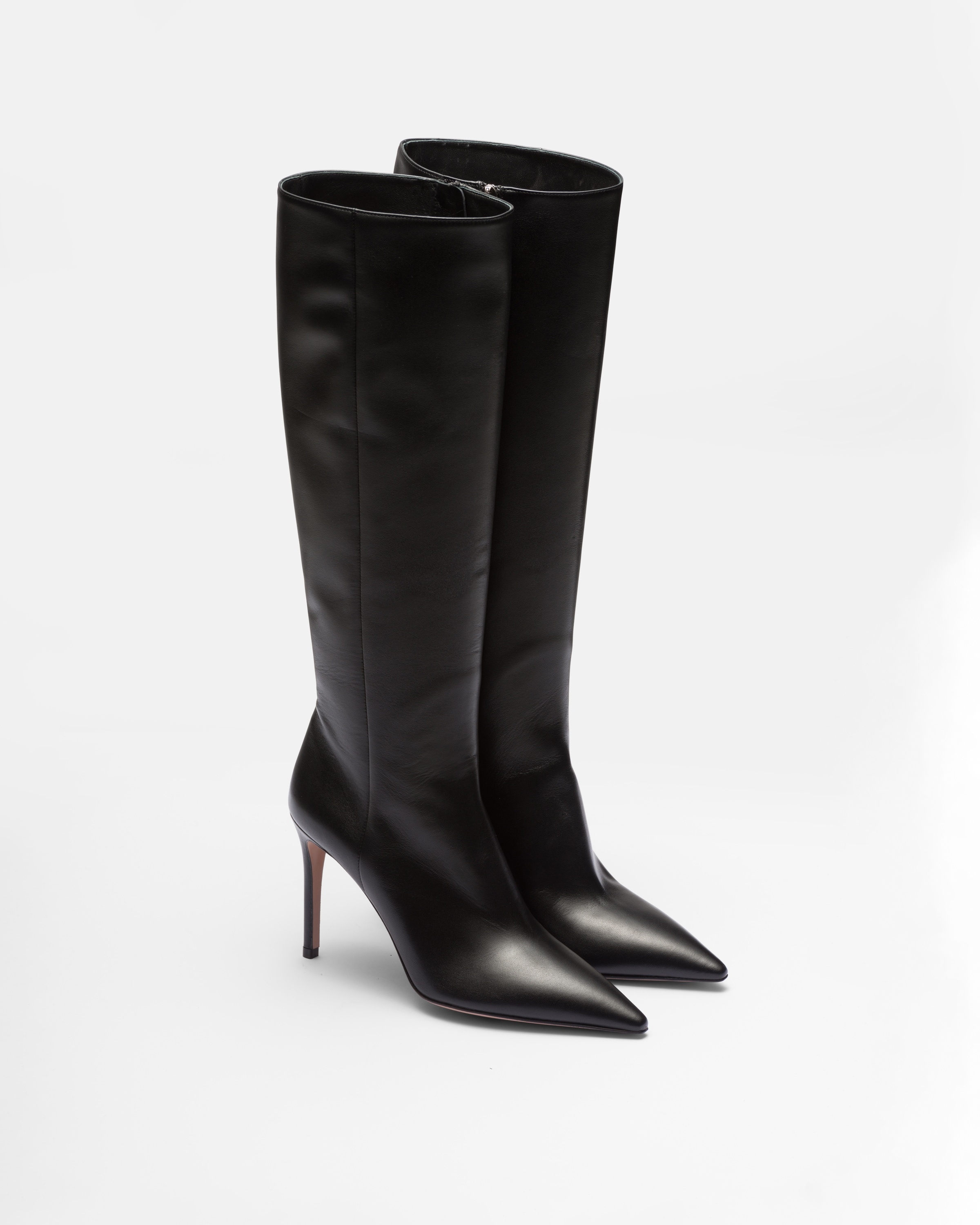 These elegant, feminine nappa leather boots are characterized by the pointy toe and the spike heel. The iconic metal lettering logo embellishes the leather sole. - Product code: 1W248N_038_F0002_F_095 - Leather lining - Side zipper closure - 39 cm high boot leg - Leather sole and rubber heel tip with metal lettering logo - 95 mm leather-covered heel with enameled metal triangle logo - Imported MATERIALS Leather