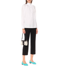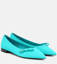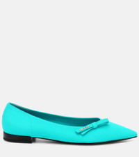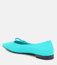 Tap Prada’s future-facing approach to fabrication with these turquoise blue ballet flats. Crafted in Italy from neoprene, they’re cut to a point-toe silhouette with charming bow-embellishment featuring the house logo in silver-tone metal letters. Product Details - Upper: fabric - Sole: leather insole, leather and rubber sole - Toe shape: pointed toe - Lining: fabric - Made in Italy - Designer color name: Turchese - Item number: P00435464 Size & Fit - Fits slightly large to size - we recommend trying a half size smaller - European sizes