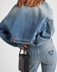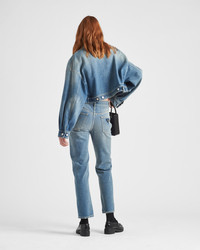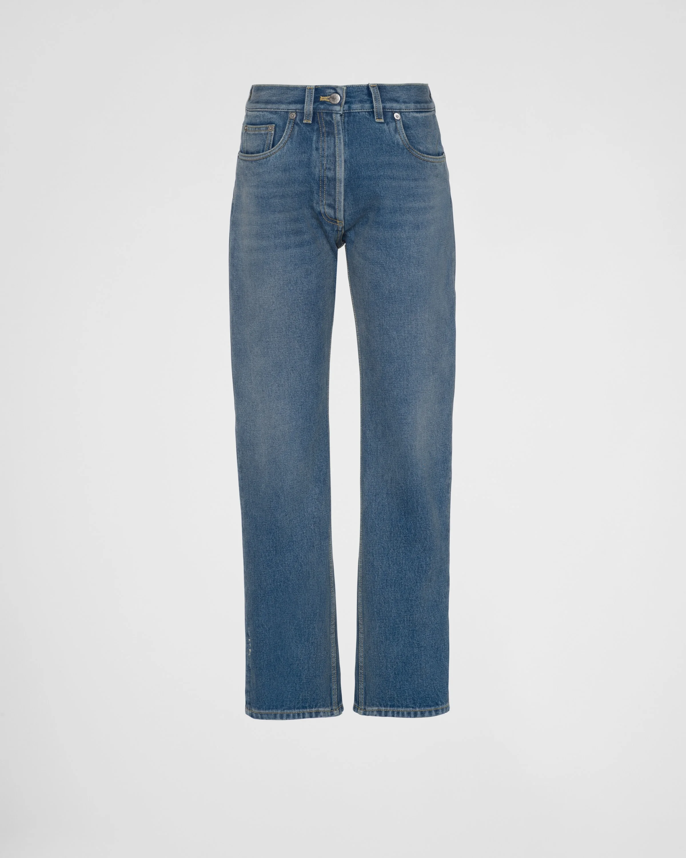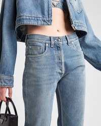 Straight cut, cropped at the ankle and with a low-rise waist, these five-pocket jeans have a washed finish that gives the organic denim a vintage look. Contrasting stitching outlines the style accented on the back by the iconic enameled triangle logo. - Product code: GFP469_13Z6_F0BAN_S_OOO - Washed denim - Five-pocket style - Straight cut - Low-rise waist - Hem length: 19.5 cm; Size: 25 - Button fly - Contrasting stitching - Rounded front pockets with coin pocket - Back patch pocket - Total length: 100 cm. Size: 25 - Enameled metal triangle logo - Imported Height: 100cm MATERIALS Main material: 100% cotton
