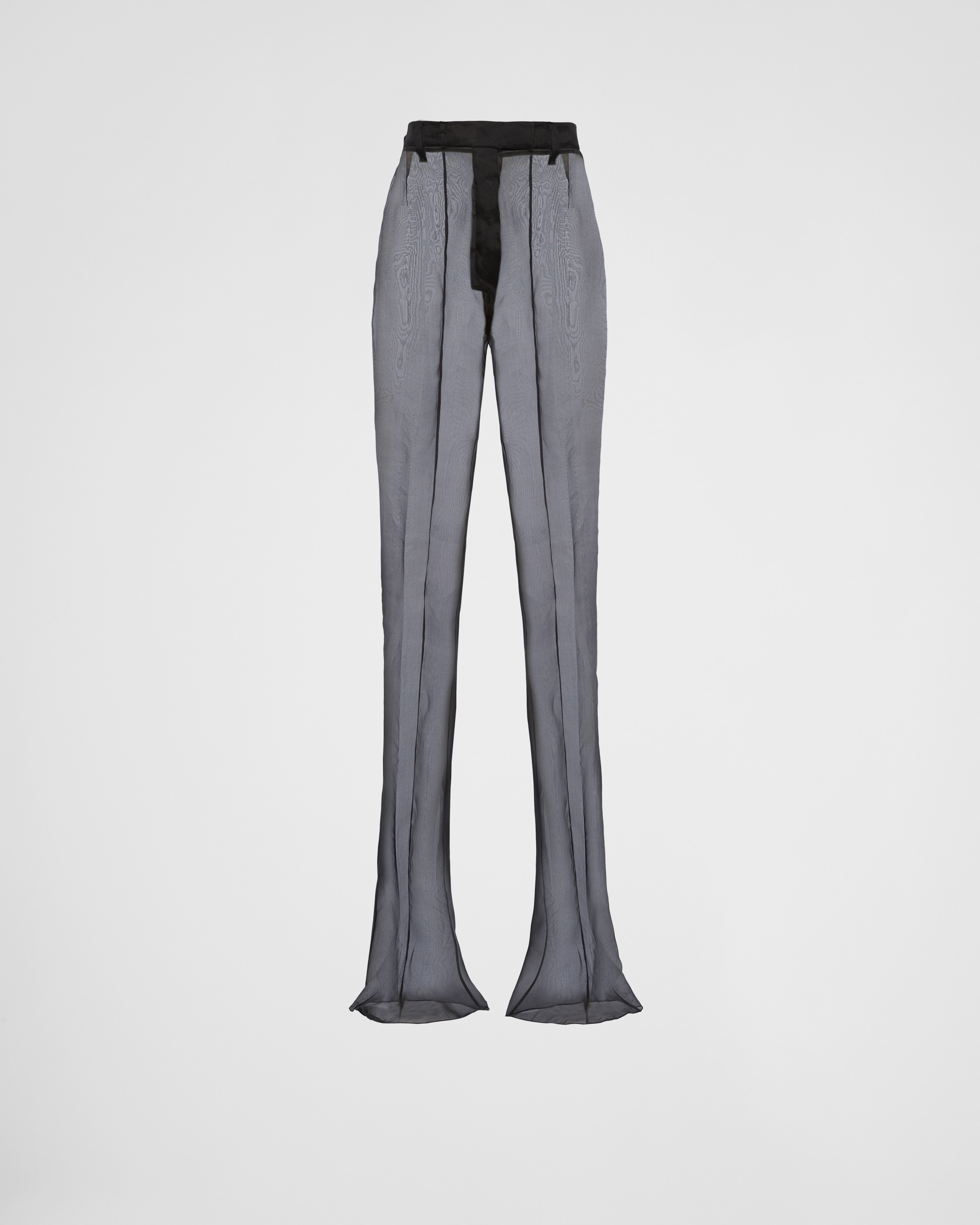 These organza pants transform a classic tailored garment into a bold, contemporary design. Playing with the characteristic duality of Prada collections, the fluid, semi-sheer style is characterized by the flared leg that emphasizes the figure. - Product code: P252H_1344_F0002_S_OOO - Flared fit - Zipper fly with hook - Imported - The model is 178 cm tall and wears a size 38 Height: 115cm MATERIALS Silk