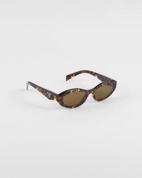 Acetate sunglasses with curved and slightly faceted rims. The slim temples are emphasized by a refined three-dimensional detail that iconographically interprets the triangle logo of the fashion house. - Product code: SPR26Z_E14L_FE09Z_C_055 - Recycled bio-acetate frame front - Color: Honey Tortoiseshell - Frame not compatible with graduated lenses - 100% UVA / UVB protection - Standard Fit - Lens-nose-temple measurement : 55-16-145 mm - Article comes with dedicated packaging - Other available colors - Imported MATERIALS Acetate