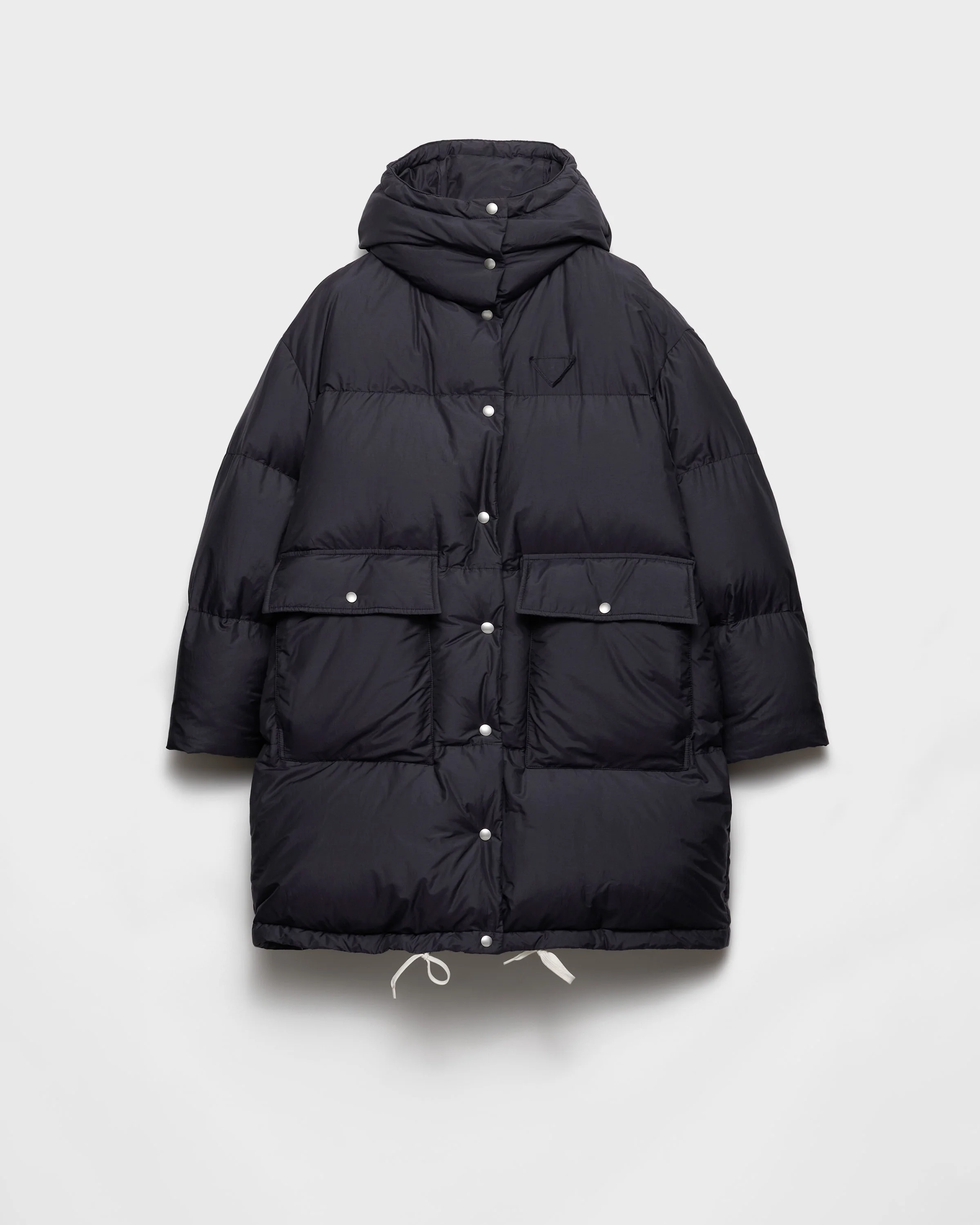 Enveloping, functional, and with a distinctive design. This down parka with adjustable hood, patch pockets, and goose down padding was designed to ensure volume and comfort. - Product code: 29Y290_17K9_F0008_S_OOO - Relaxed fit - Fits up to two sizes larger - Goose down padding - Long sleeves - Zipper and snap closure - Enameled metal triangle logo - Oversized fit - With hood - Flapped patch pockets with snap - Drawstring on the hood and hem - Imported - The model is 180 cm tall and wears a size 38 MATERIALS Main material: 74% cotton 26% polyamide