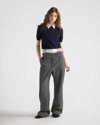 The shape of the emblematic triangle, introduced as a cut-out in the design of this wool sweater, adds a modern, conceptual note to the classic style. - Product code: P24Q2I_165P_F0008_S_OOO - Short sleeves - Plain knit - Boxy fit - Ribbed knit crew neck - Regular shoulder - Ribbed knit sleeve trim and hem - Cut-out triangle logo - Imported - The model is 178 cm tall and wears a size 38 Height: 55cm MATERIALS Main material: 100% virgin wool
