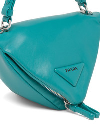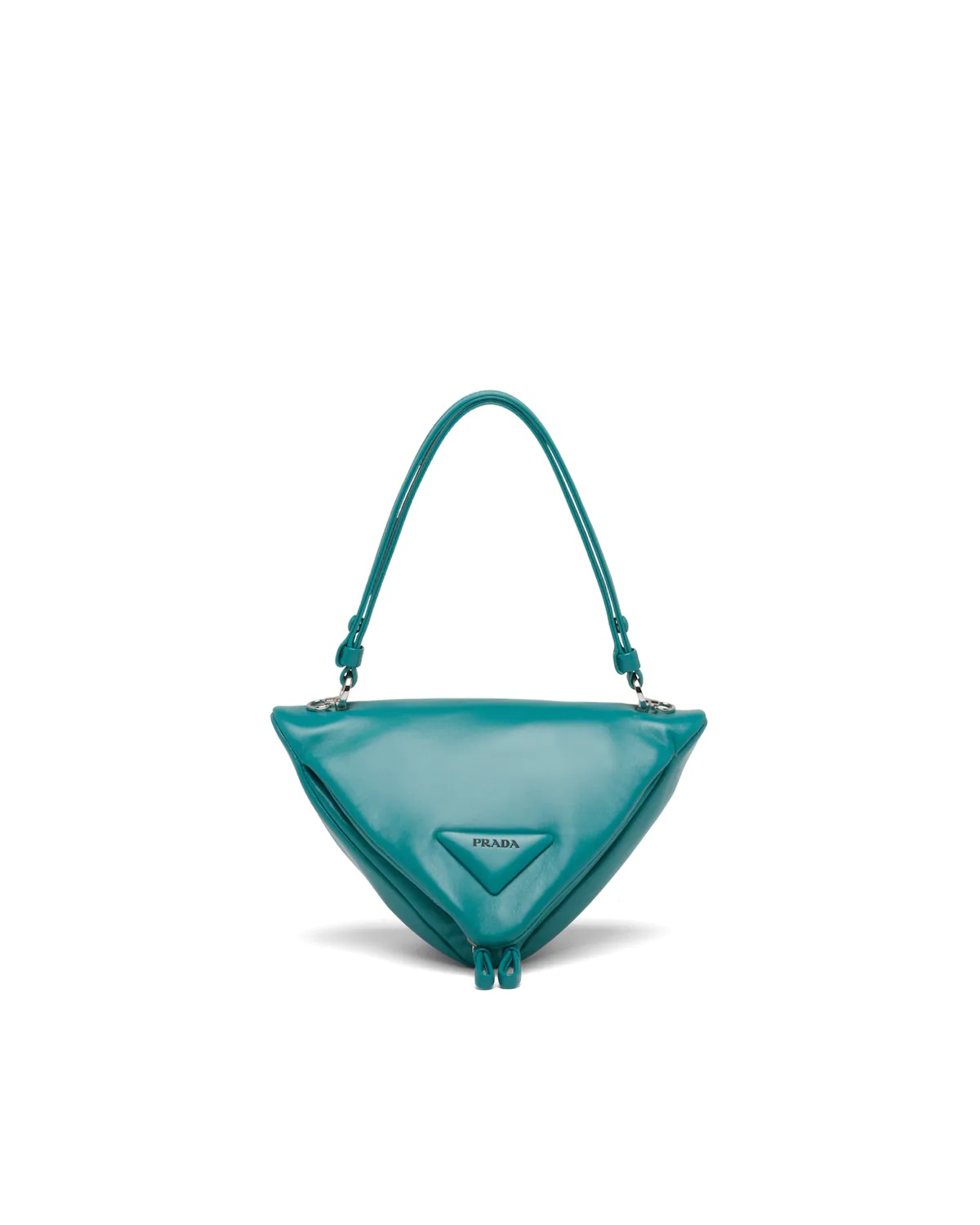 A study of the triangle inspires new geometric details and unique interpretations of the historic Prada logo. The iconic shape is reworked in the design of this handbag with soft reverse stitch construction, completed by a handle and detachable shoulder strap that lets it be worn in different ways. - Product code: 1BA315_2DX8_F0363_V_OOO - Lightly padded - Adjustable nappa leather handle - Detachable adjustable 110 cm nappa leather shoulder strap - Metal hardware - Printed logo on the leather triangle on the flap - Flap closure with zipper - Logo-print nylon lining - Length: 14cm - Width: 13.5cm MATERIALS Leather