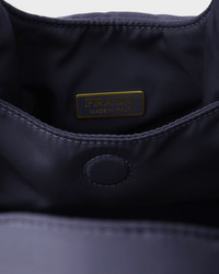 With a design based on subtle contrasts and iconic details, this padded Re-Nylon bag expresses a romantic yet unconventional spirit. The soft silhouette is animated by an oversized bow with a minimalist design that suggests new, contemporary femininity. For sustainable care to preserve the product's characteristics and reduce microfiber shedding, we recommend not washing the item too often. Let the product air out after every use and have it dry cleaned at a specialized ecological dry cleaners. - Product code: 1BA359_RP0C_F0216_V_OXO - Fabric handles - Detachable, adjustable nappa leather shoulder strap. Maximum length 110 cm - Minimum length 100 cm - Maximum drop 55 cm - Minimum drop 50 cm - Metal hardware - Enameled metal triangle logo on the front - Magnetic closure - Re-Nylon interior with three compartments - Imported Height: 15.5cm Width: 18cm Length: 10cm MATERIALS Main material: Recycled polyamide