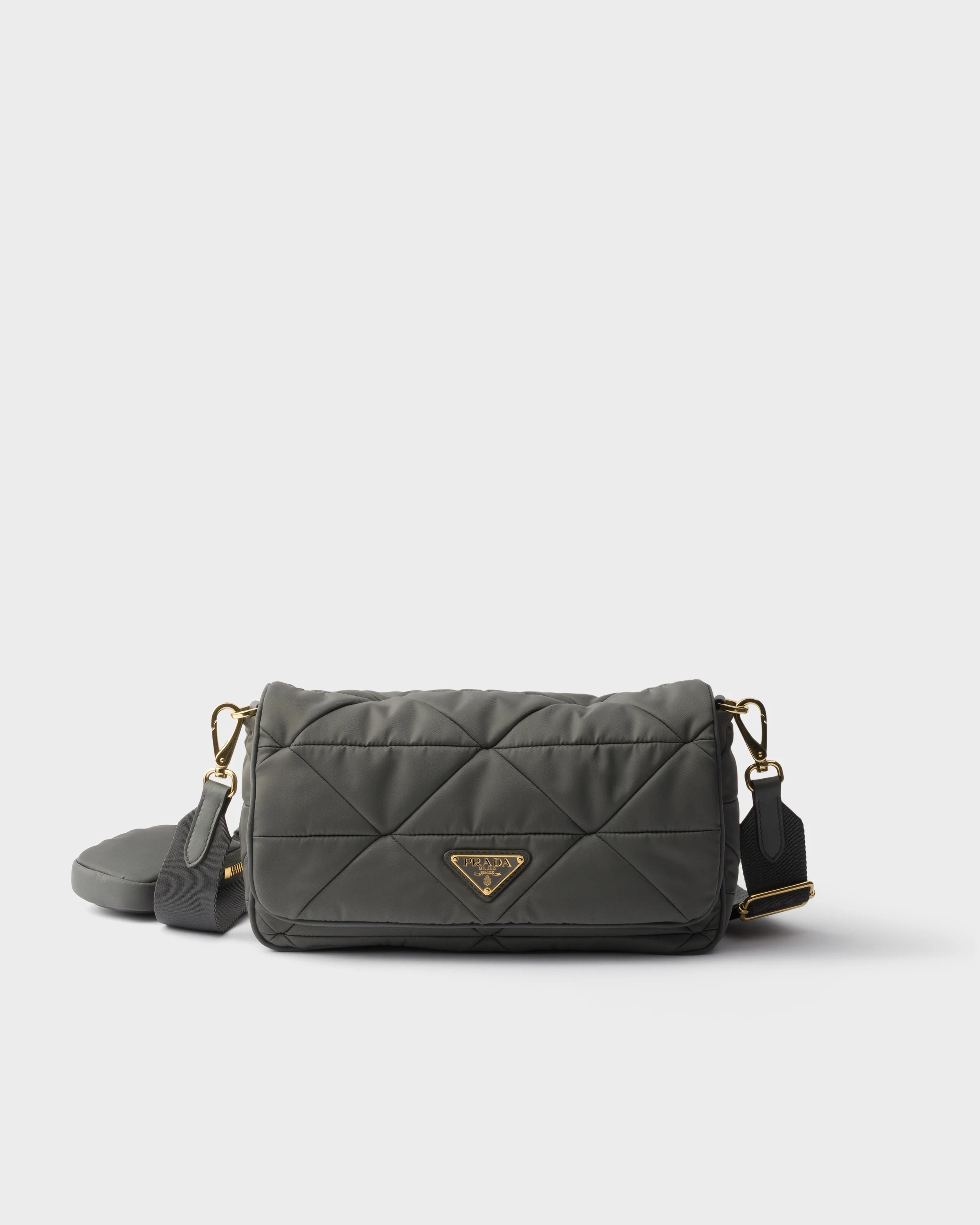 A triangle motif characterizes this padded crossbody bag, crafted from Re-Nylon with a soft design. The style is adorned with the iconic enamel metal triangle logo and comes with a detachable nylon zipper pouch for added functionality and a contemporary touch. For sustainable care to preserve the product's characteristics and reduce microfiber shedding, we recommend not washing the item too often. Let the product air out after every use and have it dry cleaned at a specialized ecological dry cleaners. - Product code: 1BD290_RDJN_F0ST1_V_D9M - Padding with triangle stitching - Detachable, adjustable logo-print woven tape shoulder strap, Length: 90 cm - Maximum length 125 cm – Minimum length 80 cm – Maximum drop 65 cm – Minimum drop 43 cm - Removable Re-Nylon zipper pouch - Metal hardware - Enameled metal triangle logo on the flap - Flap and zipper closure - Logo-print Re-Nylon lining with two pockets, including one with zipper - Imported Height: 15cm Width: 26cm Length: 7cm MATERIALS Main material: Recycled Polyamide