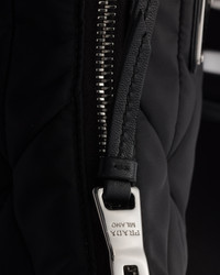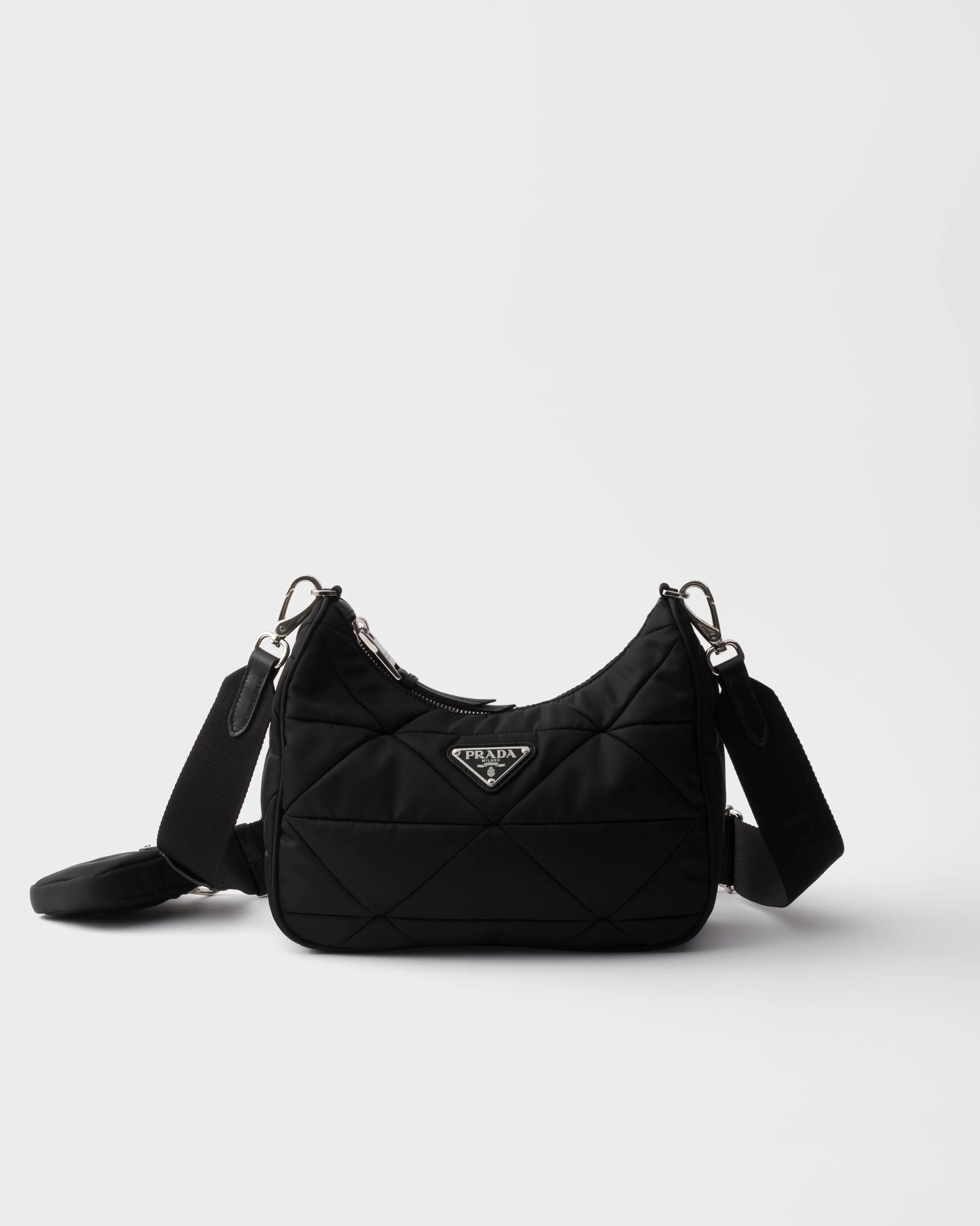 A triangle motif characterizes this padded hobo bag, crafted from Re-Nylon with a soft design. The style is adorned with the iconic enamel metal triangle logo and comes with a detachable nylon zipper pouch for added functionality and a contemporary touch. For sustainable care to preserve the product's characteristics and reduce microfiber shedding, we recommend not washing the item too often. Let the product air out after every use and have it dry cleaned at a specialized ecological dry cleaners. - Product code: 1BC151_RDJN_F0002_V_D9M - Padded triangle motif - Adjustable woven tape shoulder strap. Length: 85 cm - Maximum length 104 cm – Minimum length 70 cm – Maximum drop 60 cm – Minimum drop 46 cm - Detachable Re-Nylon zipper pouch - Metal hardware - Enameled metal triangle logo on the front - Zipper closure - Logo-print Re-Nylon lining with zipper pocket - Imported Height: 20.5cm Width: 24cm Length: 8cm MATERIALS Main material: Recycled polyamide