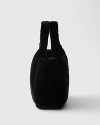 This velvet mini handbag features soft volumes and sleek lines. The elegant and contemporary accessory is decorated with the iconic enameled metal triangle logo. - Product code: 1BA410_2C7P_F0002_V_OOO - Velvet handles - Detachable, adjustable leather shoulder strap, length 100 cm. - Metal hardware - Enameled metal triangle logo on the front - Magnetic closure - Satin lining with three compartments - Imported Height: 14cm Width: 16cm Length: 7.5cm MATERIALS Main material: Cupro viscose