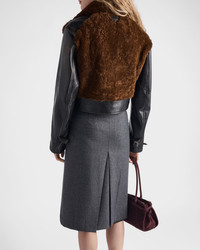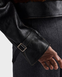 Prada reimagines the classic aviator jacket with updated details and vintage-inspired finishes. Crafted in leather with shearling inserts, the design is completed with the iconic triangle logo on the back. - Product code: 58A238_172N_F0807_S_OOO - Lined - Straight fit - Center zip closure - Shirt collar - Straight sleeves and cuffs, drawstring and buckle - Welt pockets - With belt - Leather triangle logo at center back - Vintage treatment - Imported - The model is 180 cm tall and wears a size 38 Height: 50cm MATERIALS Main material: Lambskin