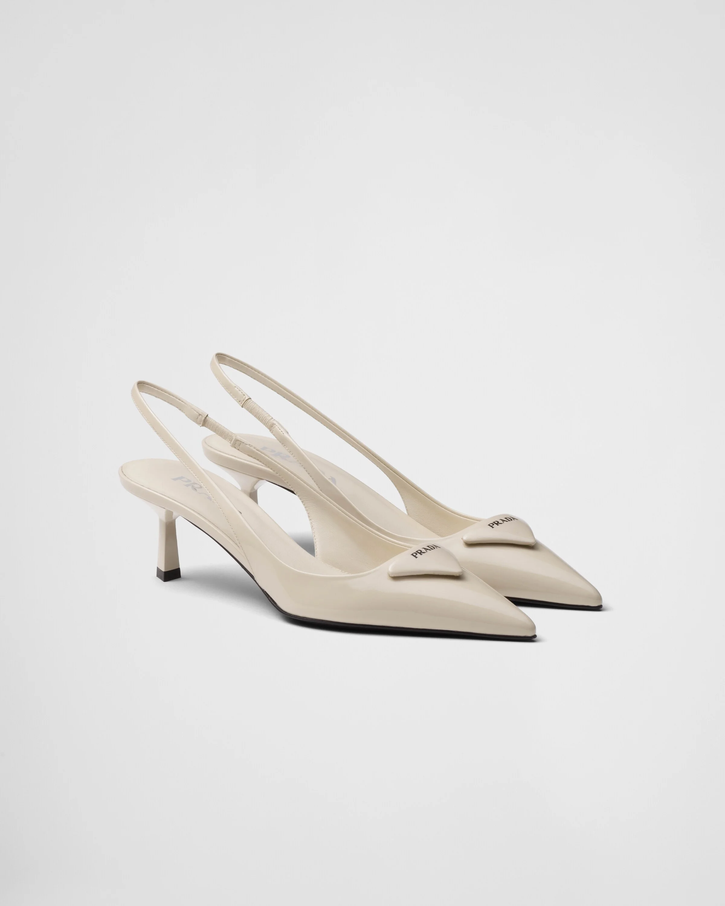 These patent leather pumps express feminine, refined elegance with contemporary allure. The triangle logo returns as a slightly padded leather detail and inspires the geometric line of the heel that enhances the silhouette with a modernist note. - Product code: 1I901M_XUW_F0304_F_DD55 - Screen-printed leather triangle logo - Leather sole and rubber heel cap with metal lettering logo - Varnished heel, height 55 mm - Imported MATERIALS Main material: Calfskin