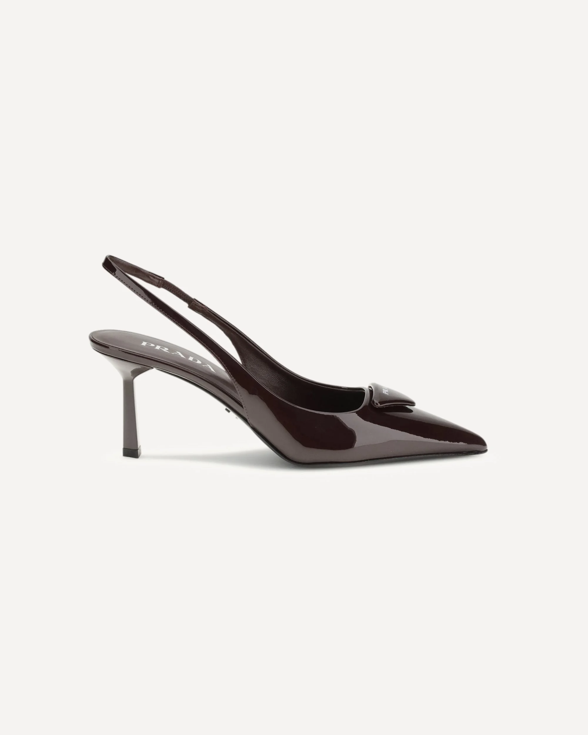The patent leather slingback Pumps by Prada are the epitome of contemporary elegance. Made of glossy patent leather with a tapered pointed silhouette, these shoes combine sophistication and boldness. The triangle logo, reinterpreted in leather with a three-dimensional design, enriches the upper, adding a distinctive and modern touch. The heel, geometric and slender, echoes the iconic lines of the logo, creating a perfect balance between aesthetics and functionality. The leather sole, embellished with the metal lettering logo, completes the look with an understated luxury detail. A pair of shoes that will elegantly adapt to any occasion, elevating any outfit with class. DETAILS - Sku: 1I901MFDD75XUM_F0GCM - Season: AW25 - Composition: GENERAL 100% Calf Leather Bos Taurus - MADE IN ITALY