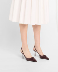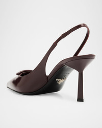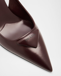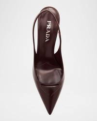 - Prada smooth patent calf leather pumps with padded logo triangle accent - 3.00 in / 75 mm stiletto heel - Pointed toe - Stretch slingback strap - Leather outsole - Professional cleaning recommended, spot clean - Made in Italy - Size Note: Runs true to size.