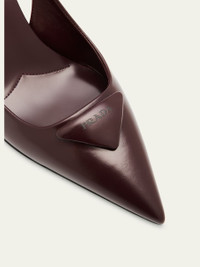 Prada smooth patent calf leather pumps with padded logo triangle accent 3.00 in / 75 mm stiletto heel Pointed toe Stretch slingback strap Leather outsole Professional cleaning recommended, spot clean Made in Italy Size Note: Runs true to size. Online Inquiries: BGS21_X6DLK| Store Inquiries: #4685094