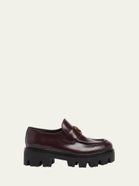 Prada platform leather loafers with signature enameled metal triangle logo 2.00 in / 50 mm chunky block heel Round moc toe Notched vamp with keeper strap Slipon style Rubber outsole Lining: Leather Made in Italy