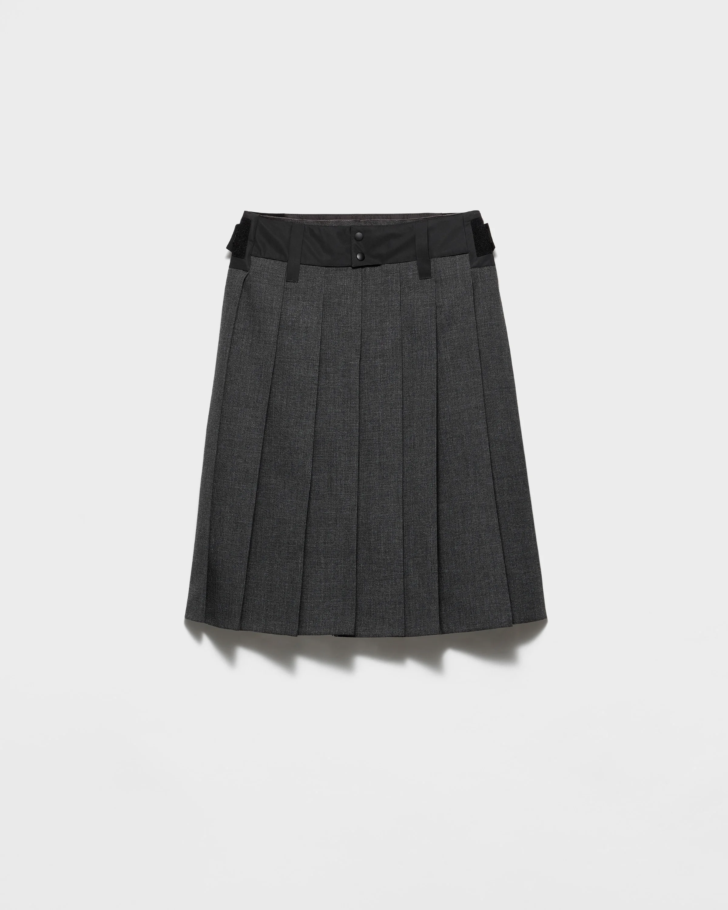 This tailored skirt with sporty details expresses a continuous dialogue between opposites that animates the Prada aesthetic. Blending movement and structure, the pleated style is characterized by unexpected interactions that redefine the feminine silhouette. - Product code: P184Z_18V5_F0480_S_OOO - Pleated fit - Garment with slip - Front button closure - Technical fabric yoke with enameled snaps - Imported - The model is 180 cm tall and wears a size 38 Height: 78cm MATERIALS Main material: 100% virgin wool