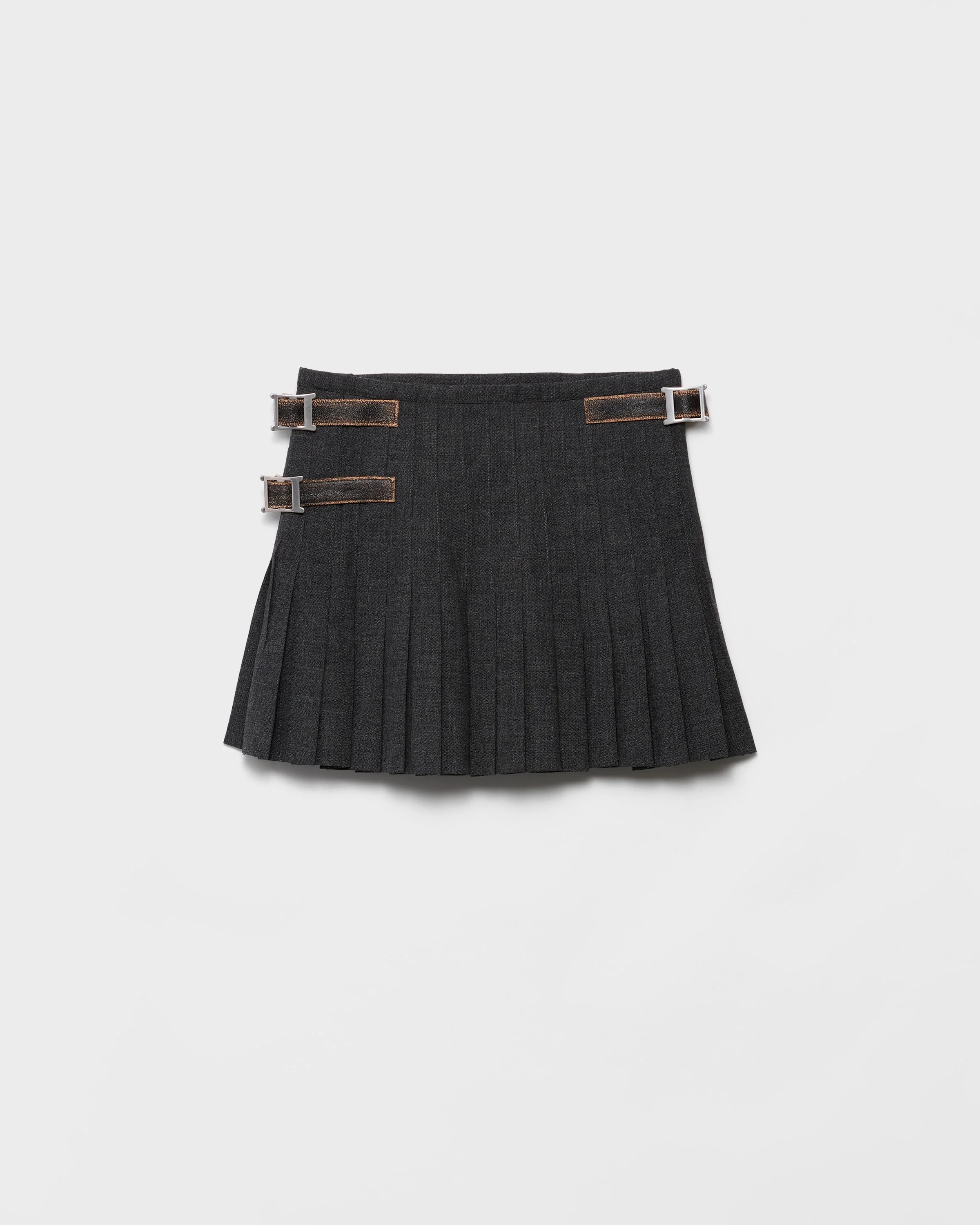 The pleated miniskirt is constantly reinterpreted with new fabrics and details that enhance the timeless silhouette. This wool garment plays with layering feminine elements and bold details like the leather straps with a vintage effect. - Product code: P147ZE_17N1_F0480_S_OOO - Pleated motif - Lined garment - Side zipper closure with hook - Decorative leather strap detail on the sides - Imported - The model is 180 cm tall and wears a size 38 MATERIALS Main material: 100% virgin wool