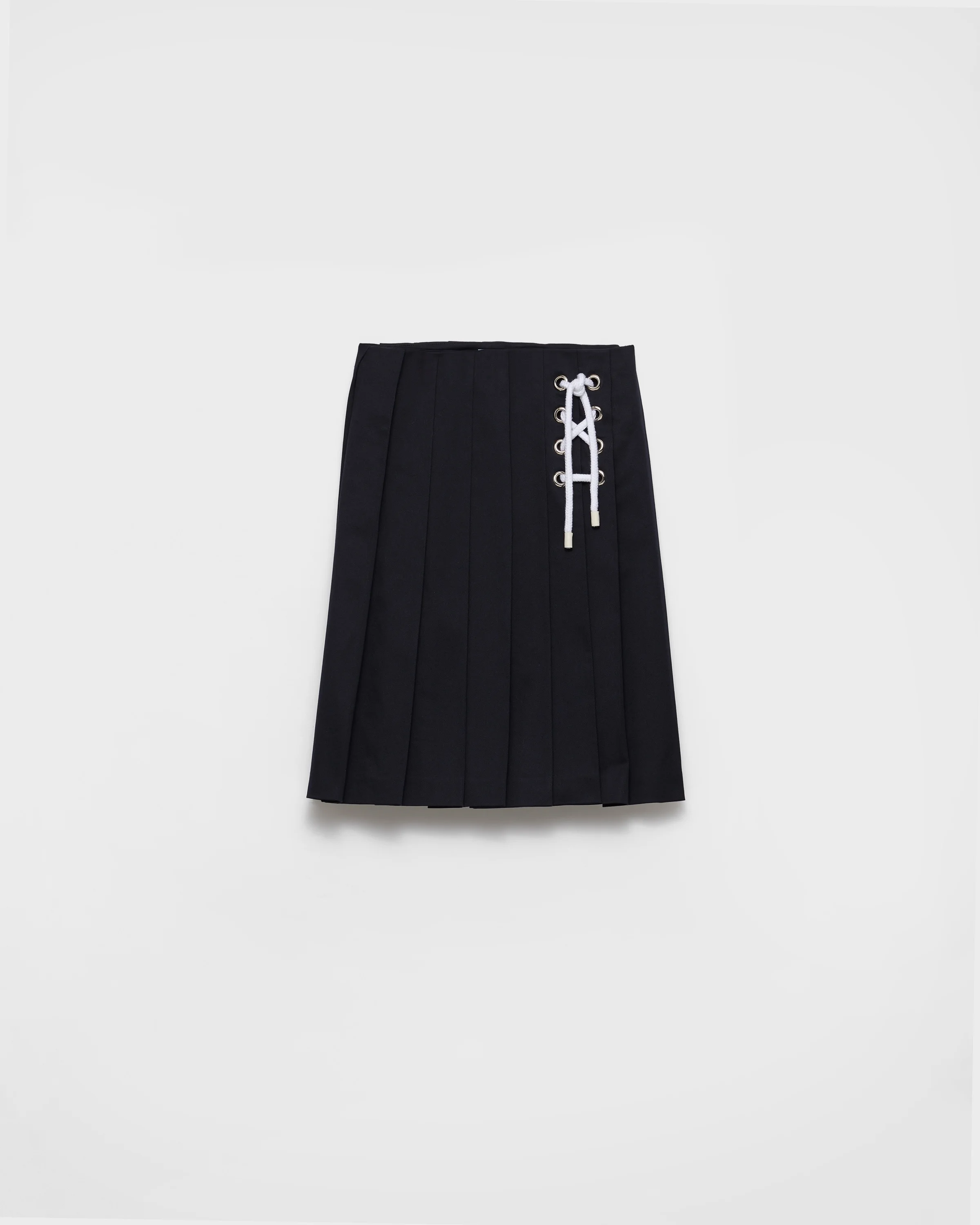 The pleated skirt, a wardrobe classic with timeless appeal, is reinterpreted in silhouette with graphic lines. The garment, a synthesis of the multiple universes composing the Prada aesthetic, is characterized by a cord detail inspired by nautical style. - Product code: P105W_P33_F0008_S_OOO - Pleating - Side zipper closure with hook - Grommet detail with cord - Imported - The model is 176 cm tall and wears a size 38 Height: 70cm MATERIALS Main material: 98% cotton 2% elastane