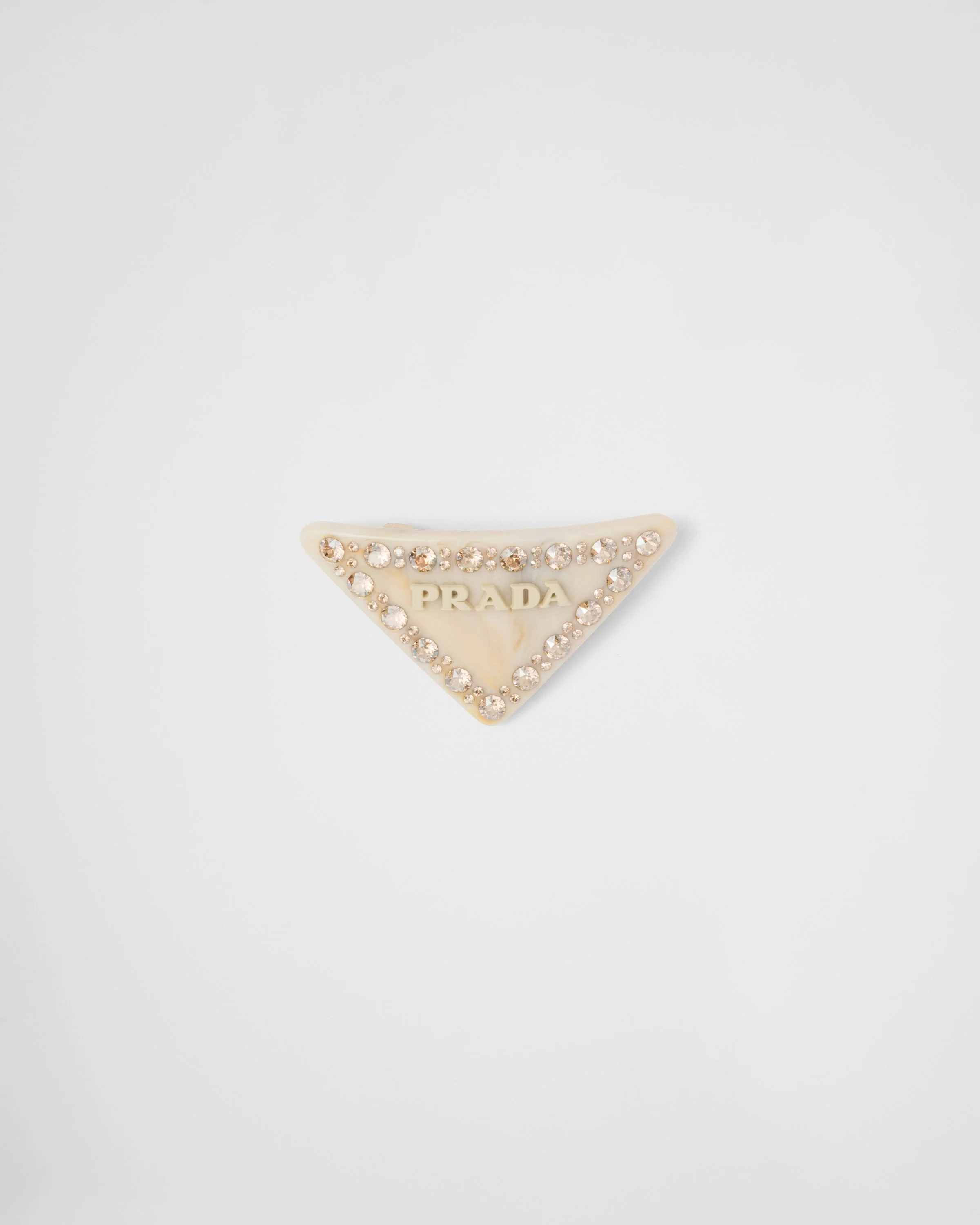 This plexiglass hair clip is covered with multifaceted crystals, creating a play on light and iridescent reflections. Logo lettering provides an iconic, luxury allure to the accessory. - Product code: 1IF090_2CD0_F0304 - With crystals - Clip fastening - Painted metal lettering logo - Imported Height: 3.07cm Width: 5.65cm MATERIALS Main material: Brass