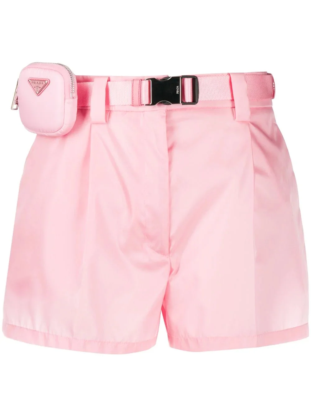 pouch belt shorts On Wednesdays we wear pink - and on any other days too. Detailed with a belted waist and a removable pouch, these shorts are the perfect mash-up of practicality and style. You can sit with Prada. Highlights - Bubblegum pink - Recycled polyamide - Mid-rise - Belted waist - Removable pouch - Enamel triangle logo - Front zip fastening - Two side slash pockets - Two rear welt pockets Composition Recycled Polyamide 100% SIZE & FIT Model measurements Height 5 ft 11 in(1.8 m) Bust/Chest 33.07 in(84 cm) Hips 37.4 in(95 cm) Waist 25.19 in(64 cm) FittingInformation This piece fits true to size. We recommend you get your regular size Designed to be fitted at the waist, loose over the leg Made with a lightweight non-stretch fabric Washing instructions Machine Wash