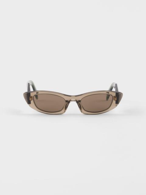 Acetate sunglasses with a bold attitude. The acetate frame features a narrow, geometric front and sharply beveled outer rims. The three-dimensional workmanship on the temples is decorated with an iconographic interpretation of the traditional Prada triangle logo. - Product code: SPRB16_E20F_FE80Q_C_050 - Recycled bio-acetate frame front - Color: Gray + Gradient Gray to Pink - Frame not compatible with graduated lenses - 100% UVA / UVB protection - Standard Fit - Lens-nose-temple measurement: 50-21-145 mm - Article comes with dedicated packaging - Other colors available - Imported MATERIALS Acetate