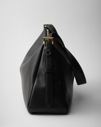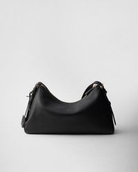 The sophisticated minimalism of the '90s inspires the new Prada Aimee bag. The design evokes the instinctive gesture of holding a bag with its soft silhouette, created for effortless wear on the shoulders or cross-body. - Product code: 1BC228_2CYS_F0002_V_LVM - Adjustable leather handle. Maximum drop 38 cm - Minimum drop 28 cm - Removable key ring - Metal hardware - Enameled metal triangle logo on the front - Zipper closure - Nappa leather lining with two pockets, including one with zipper - Imported Height: 23cm Width: 39cm Length: 12cm MATERIALS Main material: Calfskin