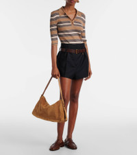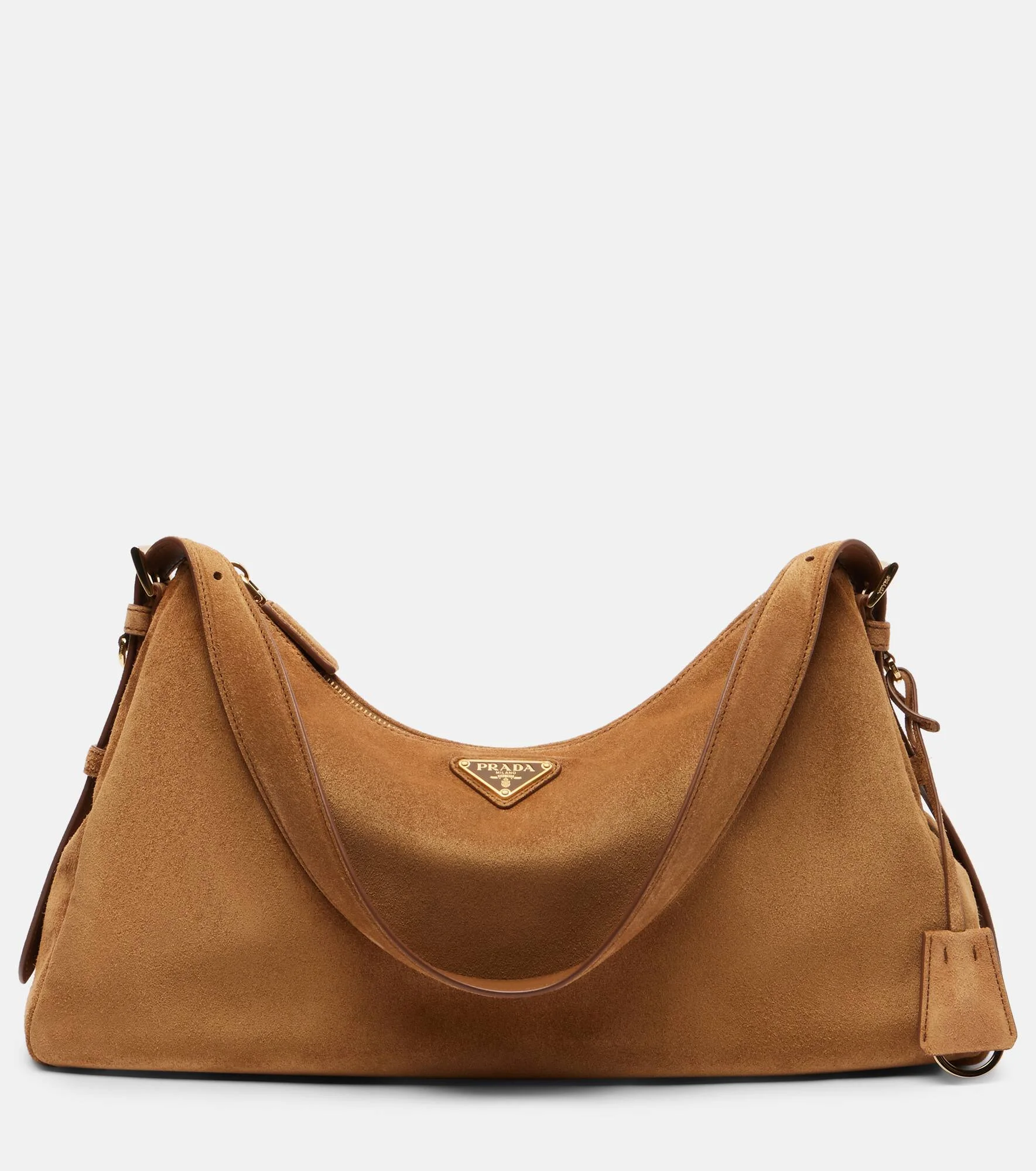 Prada takes Italian heritage into a distinctly modern direction with a streamlined and fashion-forward approach. Inspired by '90s minimalism, the Prada Aimee Medium shoulder bag is expertly crafted from suede into a softly structured silhouette with signature logo hardware. Product Details - Material: leather (suede) - Lining: leather - Made in Italy - Designer color name: Brown - Item color: brown - Detachable, adjustable shoulder strap - Hardware color: gold - Internal details: internal slot pocket, internal zipped pocket, single compartment - Closure: zipped top - Detachable charm - Includes: dust bag - Item number: P01096430 Size & Fit - Height 27/17cm-10.5/6.5" - Width 40cm-15.5" - Depth 10cm-4" - Length of handles 68/48cm-27/19"
