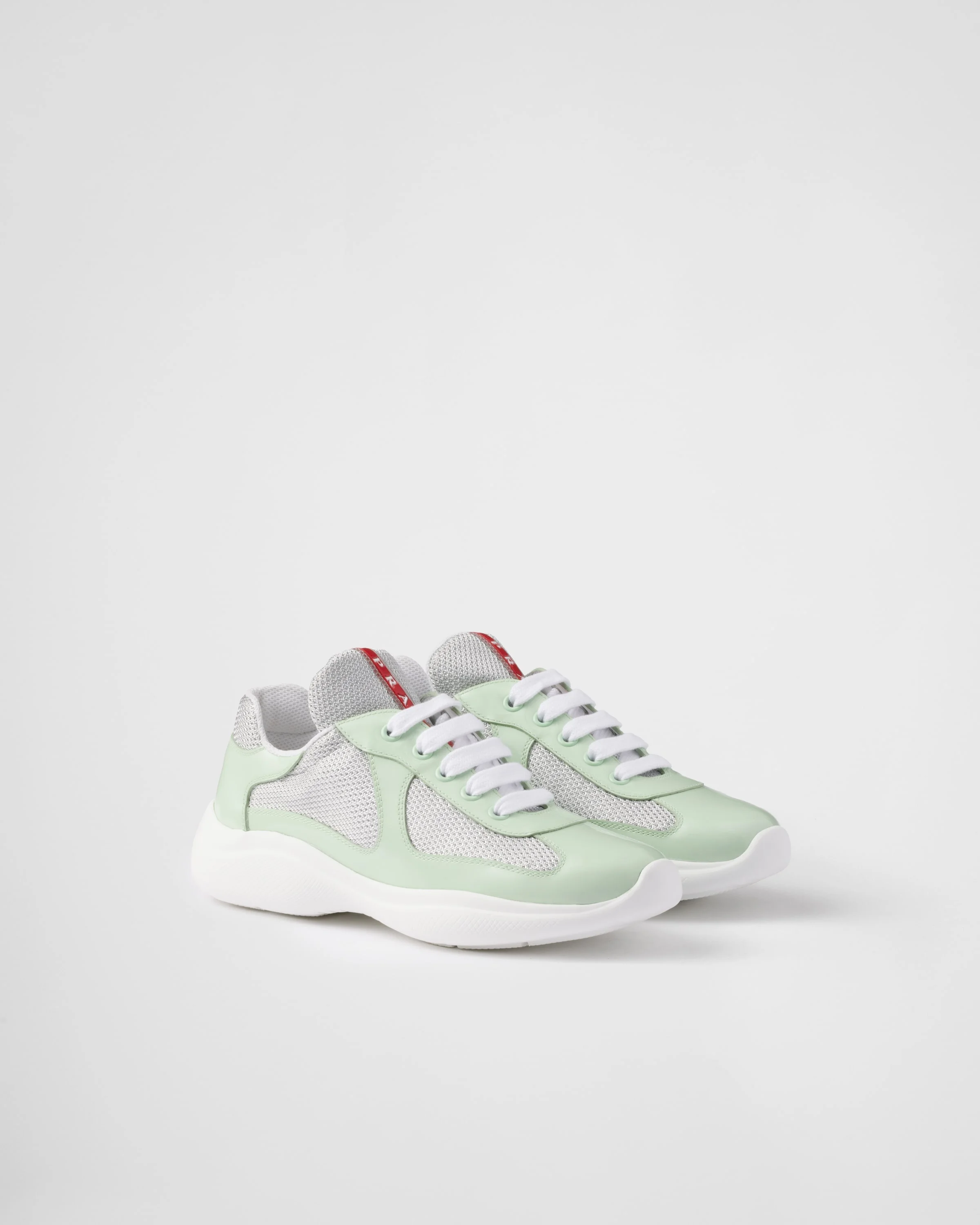 The iconic design of Prada America's Cup combines timeless lines and innovative materials. Cotton laces and an optical patterned tread enhance the product decorated with the Prada Linea Rossa logo badge. - Product code: 3E6420_ASZ_F065J_F_B025 - Technical fabric lining - Prada Linea Rossa latex logo badge - Flat cotton laces - 25 mm rubber sole - Tread with optical pattern - Removable leather-lined insole - Imported MATERIALS Main material: Calfskin