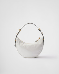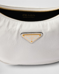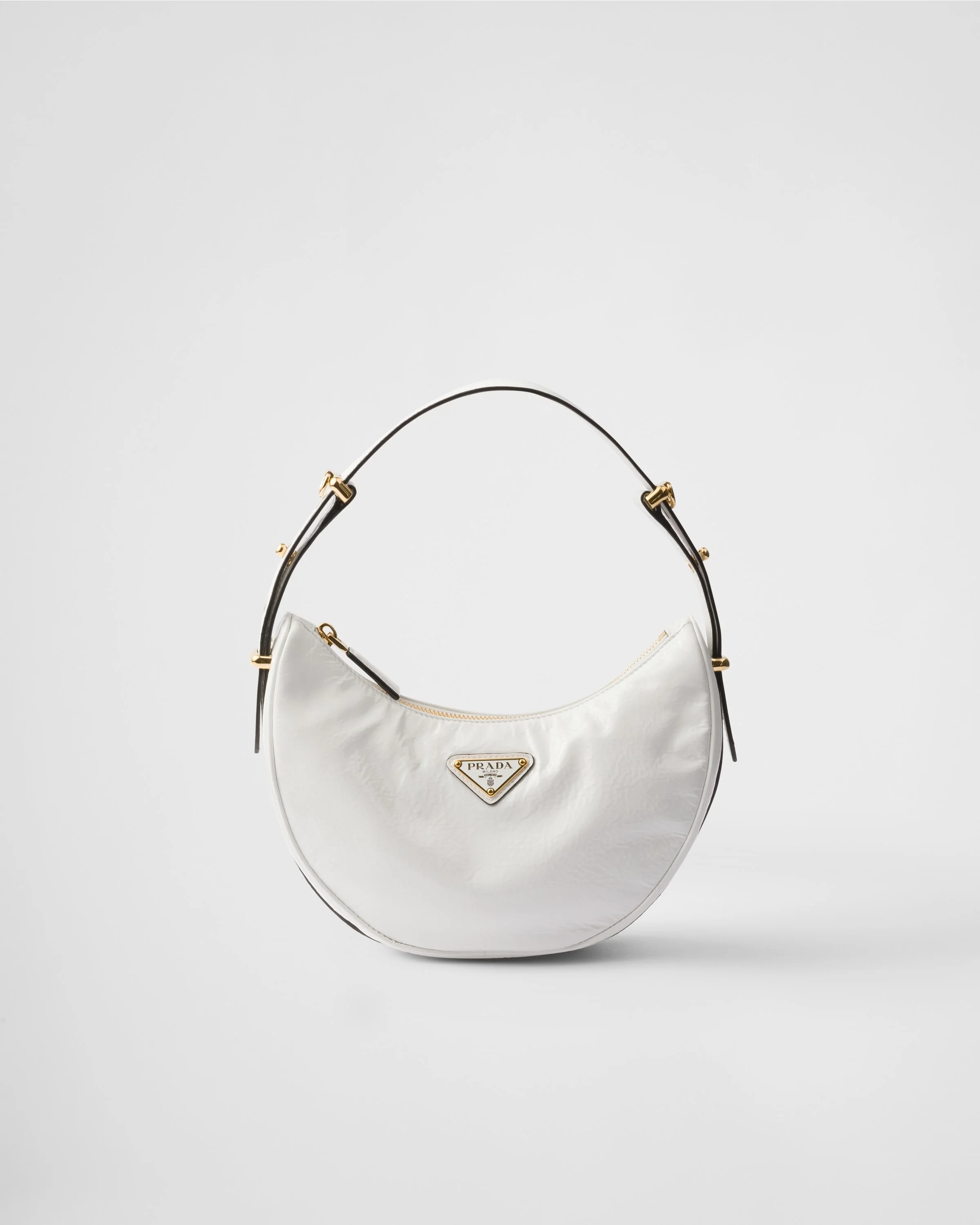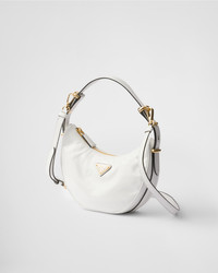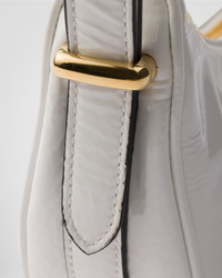 The soft, sinuous lines of the Prada Arque bag are emphasized by the naplak patent leather that gives the accessory a distinctive shiny effect and texture with vintage allure. Elegant gold-tone hardware embellishes the silhouette. - Product code: 1BC194_2DNT_F0PG7_V_OOO - Detachable and adjustable leather handle - Detachable and adjustable leather shoulder strap. Maximum length 93 cm - Minimum length 83 cm - Maximum drop 60 cm- Minimum drop 55 cm - Metal hardware - Enameled metal triangle logo on the front - Zipper closure - Nappa leather lining with patch pocket - Imported Height: 18.5cm Width: 22.5cm Length: 6cm MATERIALS Main material: Lambskin