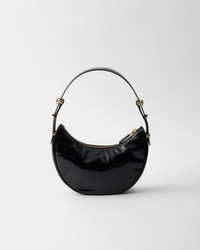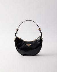 The soft, sinuous lines of the Prada Arque bag are emphasized by the naplak patent leather that gives the accessory a distinctive shiny effect and texture with vintage allure. Elegant gold-tone hardware embellishes the silhouette. - Product code: 1BC194_2DNT_F0002_V_OOO - Detachable and adjustable leather handle - Detachable and adjustable leather shoulder strap. Maximum length 93 cm - Minimum length 83 cm - Maximum drop 60 cm- Minimum drop 55 cm - Metal hardware - Enameled metal triangle logo on the front - Zipper closure - Nappa leather lining with patch pocket - Imported Height: 18.5cm Width: 22.5cm Length: 6cm MATERIALS Main material: Lambskin