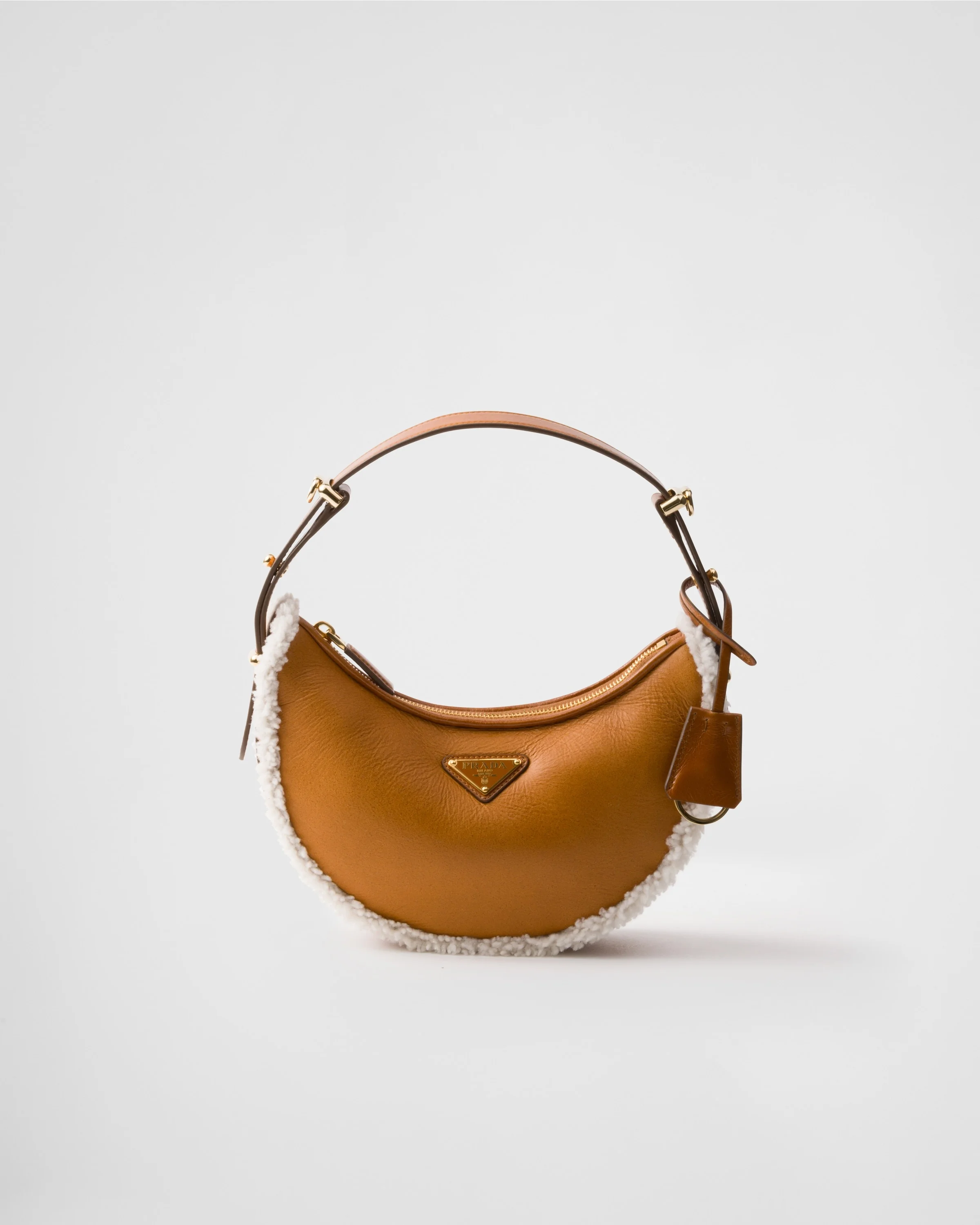 This sleek leather bag has versatile, modernist allure. The accessory with a sinuous silhouette is embellished with soft shearling and a detachable shoulder strap for versatile wear. - Product code: 1BC194_2CTT_F036S_V_OOX - Detachable, adjustable leather handle - Detachable, adjustable leather shoulder strap. Maximum length 93 cm - Minimum length 83 cm - Maximum drop 60 cm - Minimum drop 55 cm - Removable key ring - Metal hardware - Enameled metal triangle logo on the front - Zipper closure - Unlined - Imported Height: 18.5cm Width: 22.5cm Length: 6cm MATERIALS Main material: Lambskin