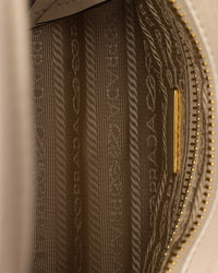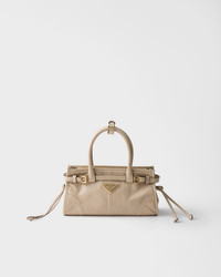 A symbol of innovation, unconventional spirit and a timeless attitude, the Bonnie bag expresses Prada's dialogue with modernity. The style is presented in a versatile and compact mini format enriched with distinctive metal buckles and laces on the sides. Soft leather with a liquid, glossy finish gives the design unmistakable style. - Product code: 1BA486_2CYR_F03MV_V_OOO - Leather handles, drop 10 cm - Detachable, adjustable leather shoulder strap. Maximum length 125 cm - Minimum length 105 cm - Maximum drop 60 cm - Minimum drop 50 cm - Metal hardware - Enameled metal triangle logo on the front - Zipper closure - Logo-print nylon lining with zipper pocket - Imported Height: 12cm Width: 23.5cm Length: 9cm MATERIALS Main material: Calfskin