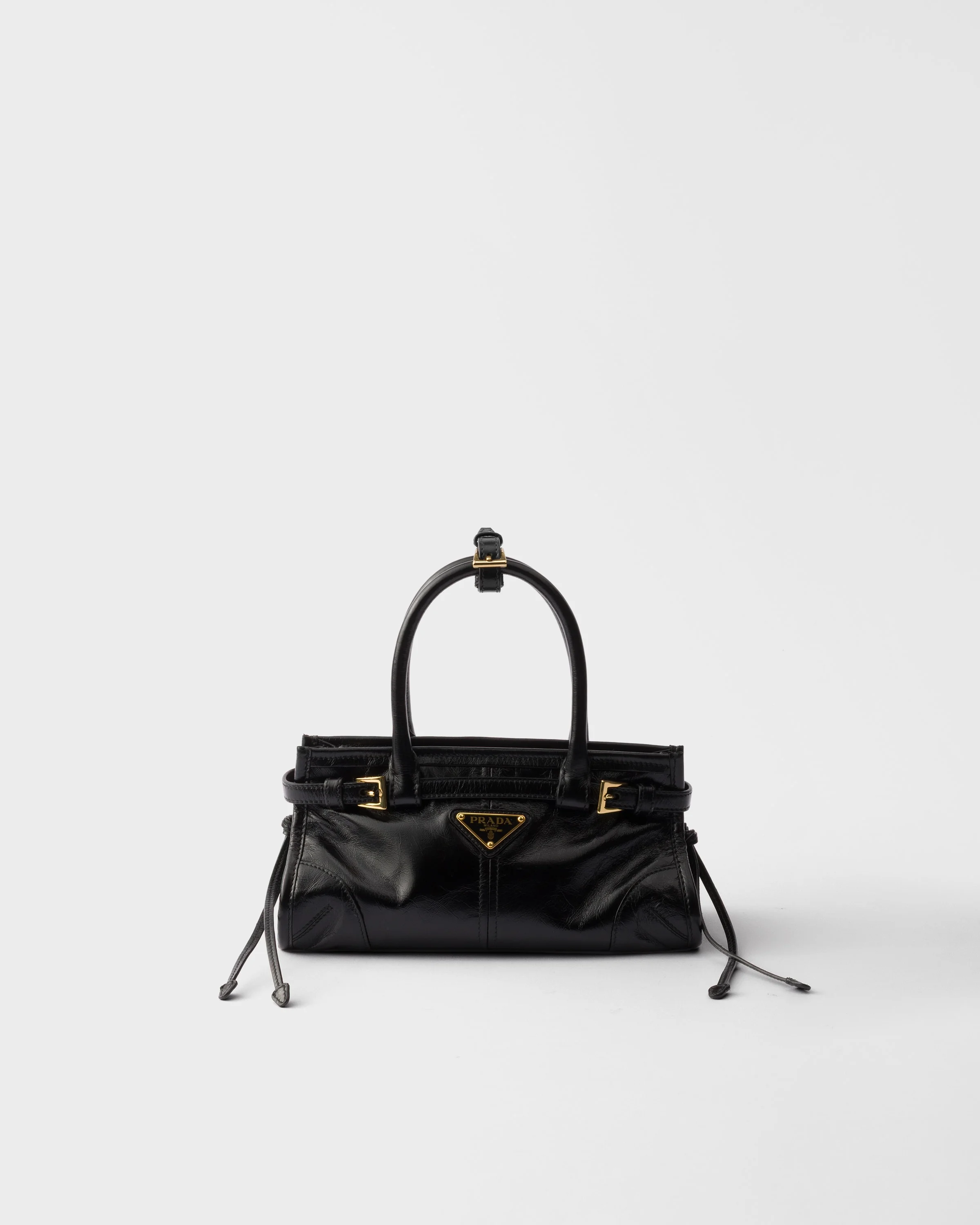 A symbol of innovation, unconventional spirit and a timeless attitude, the Bonnie bag expresses Prada's dialogue with modernity. The style is presented in a versatile and compact mini format enriched with distinctive metal buckles and laces on the sides. Soft leather with a liquid, glossy finish gives the design unmistakable style. - Product code: 1BA486_2CYR_F0002_V_OOO - Leather handles, drop 10 cm - Detachable, adjustable leather shoulder strap. Maximum length 125 cm - Minimum length 105 cm - Maximum drop 60 cm - Minimum drop 50 cm - Metal hardware - Enameled metal triangle logo on the front - Zipper closure - Logo-print nylon lining with zipper pocket - Imported Height: 12cm Width: 23.5cm Length: 9cm MATERIALS Main material: Calfskin