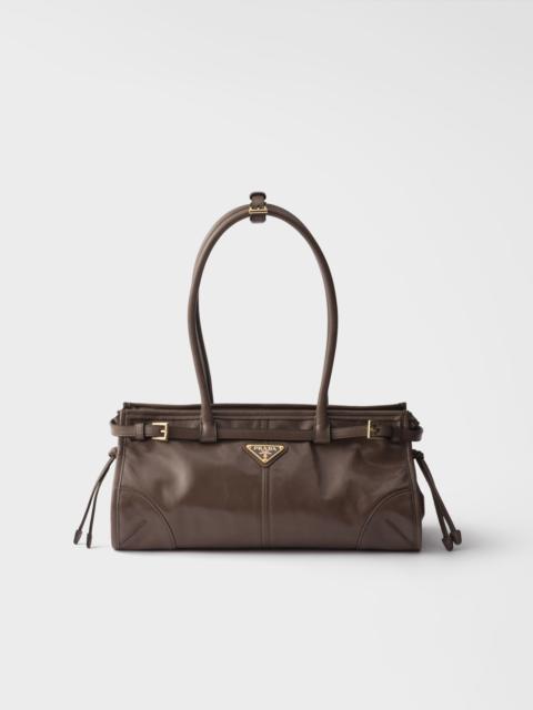 This pragmatic and refined handbag is made of soft leather with a glossy finish that emphasizes its versatile, modern allure. The geometric design blends different influences into one style with a distinctive but sleek aesthetic. Embellished by the sophisticated strap detail, the rectangular silhouette has zipper pockets inside. The enameled metal triangle logo completes the look with its iconic signature. - Product code: 1BA426_2CYR_F05GU_V_MOO - Leather handles, 22 cm drop - Detachable, adjustable shoulder strap Maximum length 125 cm - Minimum length 105 cm - Maximum drop 60 cm- Minimum drop 50 cm - Metal hardware - Enameled metal triangle logo on the front - Zipper closure - Logo-print nylon lining with zipper pocket - Imported Height: 15.5cm Width: 32cm Length: 12cm MATERIALS Main material: Calfskin