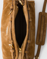 This pragmatic yet sophisticated shoulder bag has a refined, modern design emphasized by the soft texture of suede. The silhouette stands out for its elegant rectangular shape, framed by the distinctive belt detail. The detachable, adjustable shoulder strap completes the accessory decorated with the enameled metal triangle logo. - Product code: 1BH215_2C4S_F0401_V_OOO - Adjustable, detachable leather shoulder strap with shoulder pad. Maximum length 105 cm - Minimum length 100 cm - Maximum drop 55 cm- Minimum drop 52 cm - Metal hardware - Enameled metal triangle logo on the front - Zipper closure - Logo-print nylon lining with zipper pocket - Imported Height: 14cm Width: 26cm Length: 12cm MATERIALS Main material: Calfskin