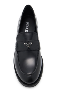 Miuccia Prada and Raf Simons reimagine the brand's archival accessories to create a fresh, sophisticated and endlessly cool collection for today and tomorrow. These loafers have been meticulously crafted in Italy from high-shine spazzolato leather that's detailed with the house's iconic logo plaque where you might typically find a penny. PRODUCT DETAILS - Heel measures approximately 25mm/ 1" - Slip on - Composition: spazzolato leather - Made in Italy