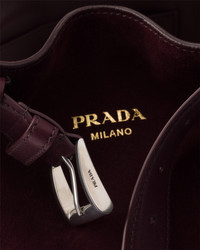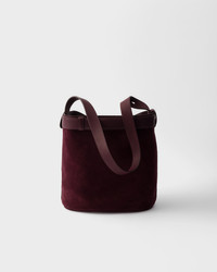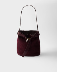 The sophisticated and modern essence of the Prada Buckle bag is rediscovered in a new bucket silhouette with sleek lines. The refined, soft texture of suede enhances the pure geometric shape of the style, enriched with the distinctive belt with iconic buckle. - Product code: 1BE085_2C4S_F0007_V_SBM - Decorative belt with buckle - Suede handle. Drop from 28 a 36 cm - Metal hardware - Printed lettering logo on the front - Nappa lining with patch pocket - Imported Height: 28cm Width: 26.5cm Length: 18cm MATERIALS Main material: Calfskin